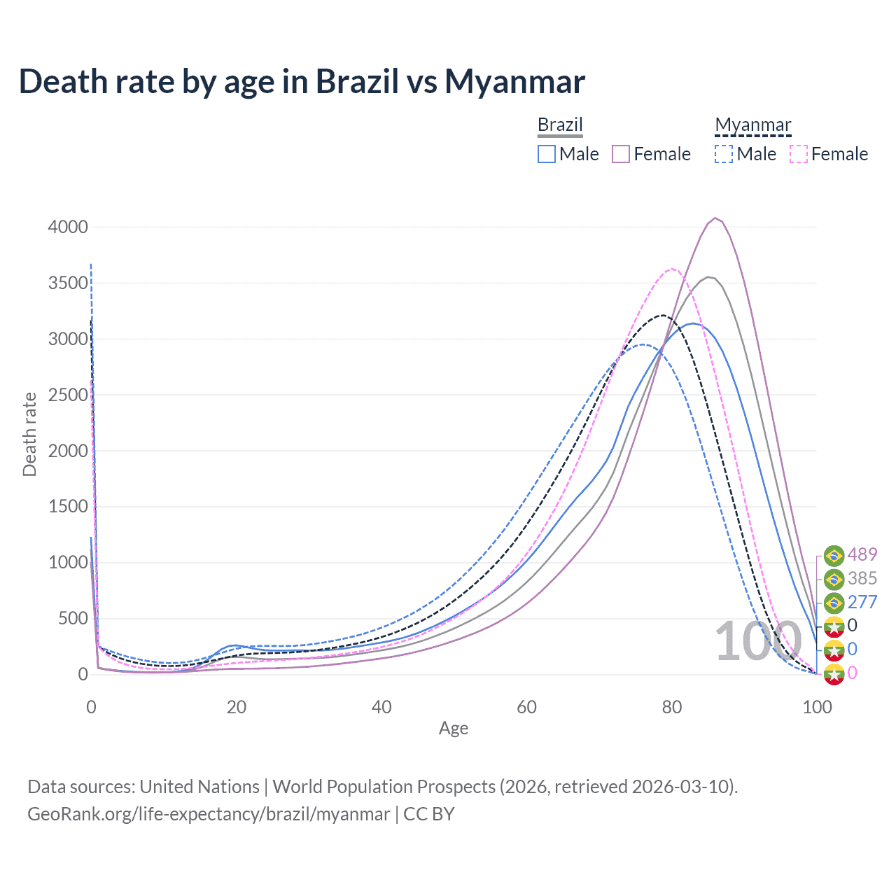 In Brazil, the most common age of death is 85, compared to 79 in Myanmar. The median age of death is 80.8 in Brazil and 73.1 in Myanmar, meaning only half of each cohort is expected to live past that age.