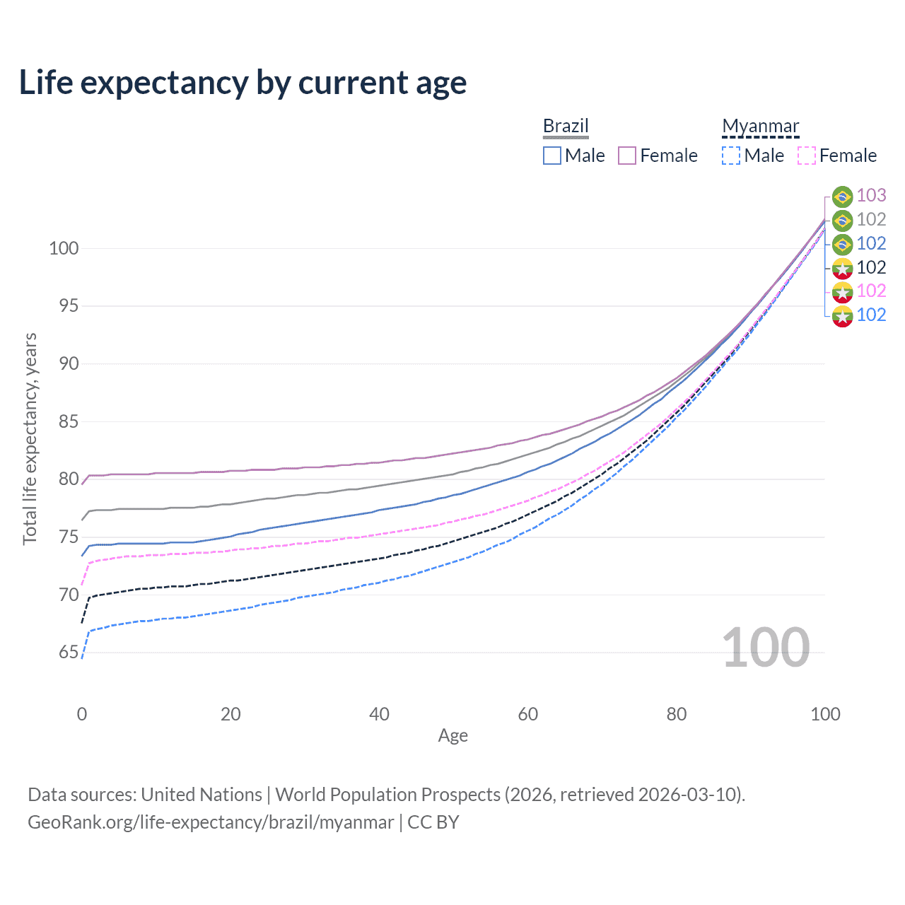 The average life expectancy at birth is 76.4 years in Brazil vs 67.5 in Myanmar. Brazil is ranked 82/197 by life expectancy, and Myanmar is 157/197. In Brazil, the life expectancy is 73.3 years for males and 79.5 years for females. In Myanmar, it's 64.4 years for males and 70.8 years for females.