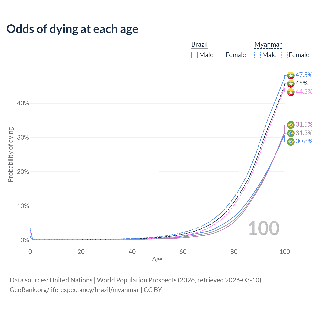 This life expectancy calculator shows the odds of living to 100, 95, 90, and below based on current age for both males and females in Brazil and Myanmar, along with mean and median age of death. The calculations are based on the 2026 life tables (actuarial tables) from the UN World Population Prospects.