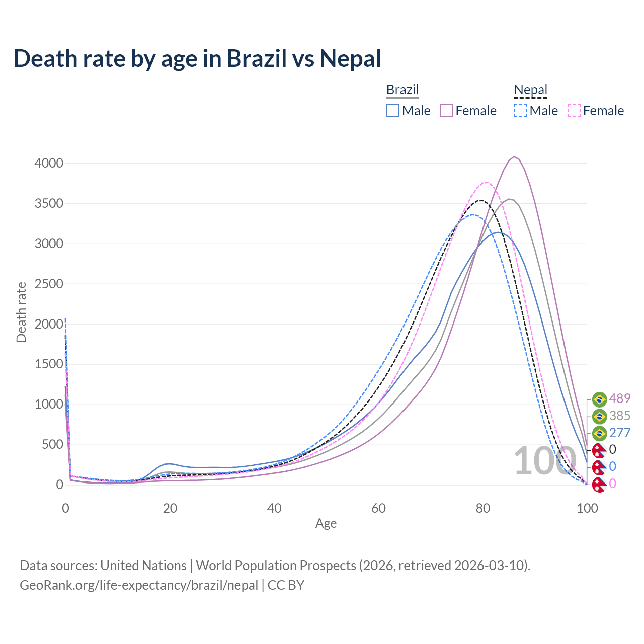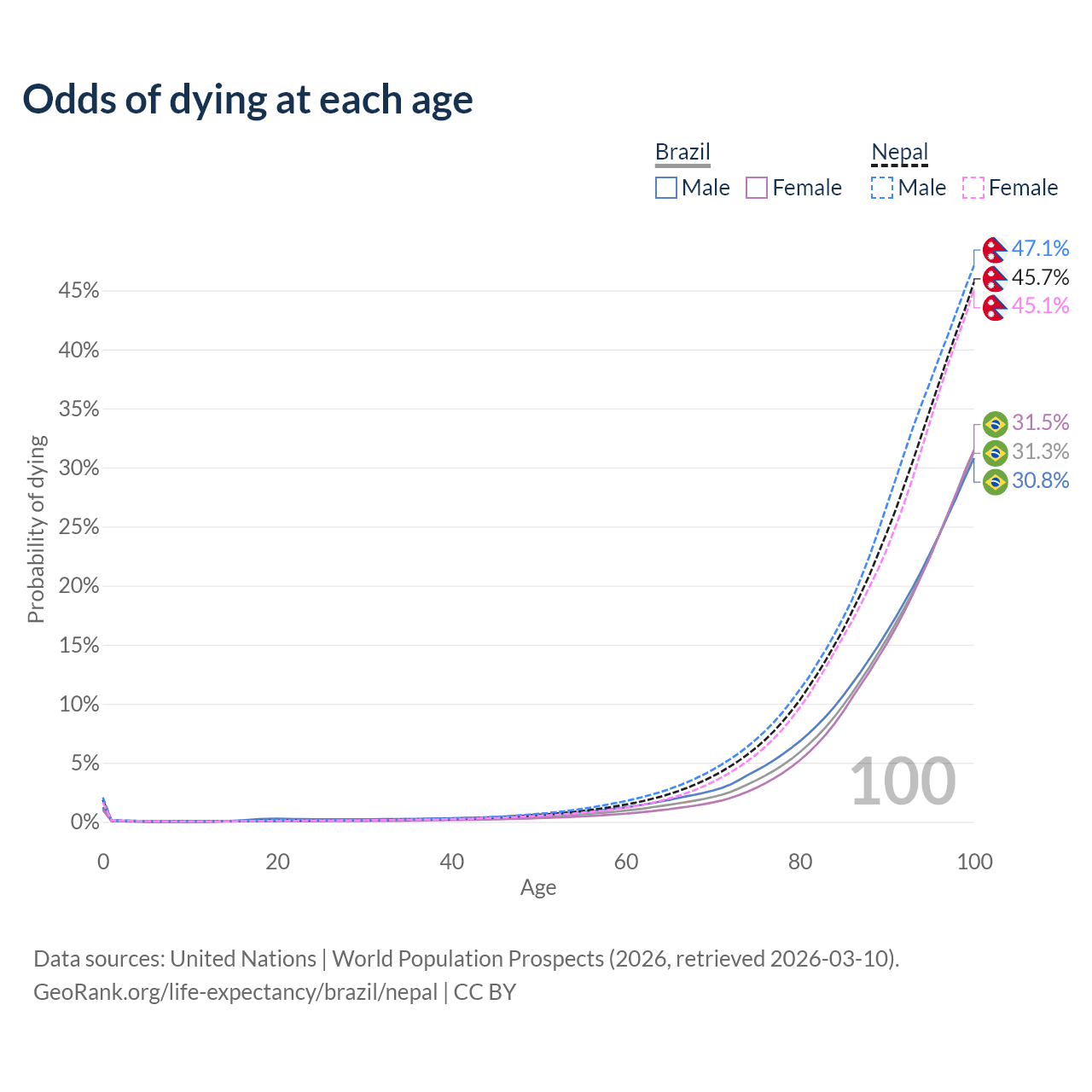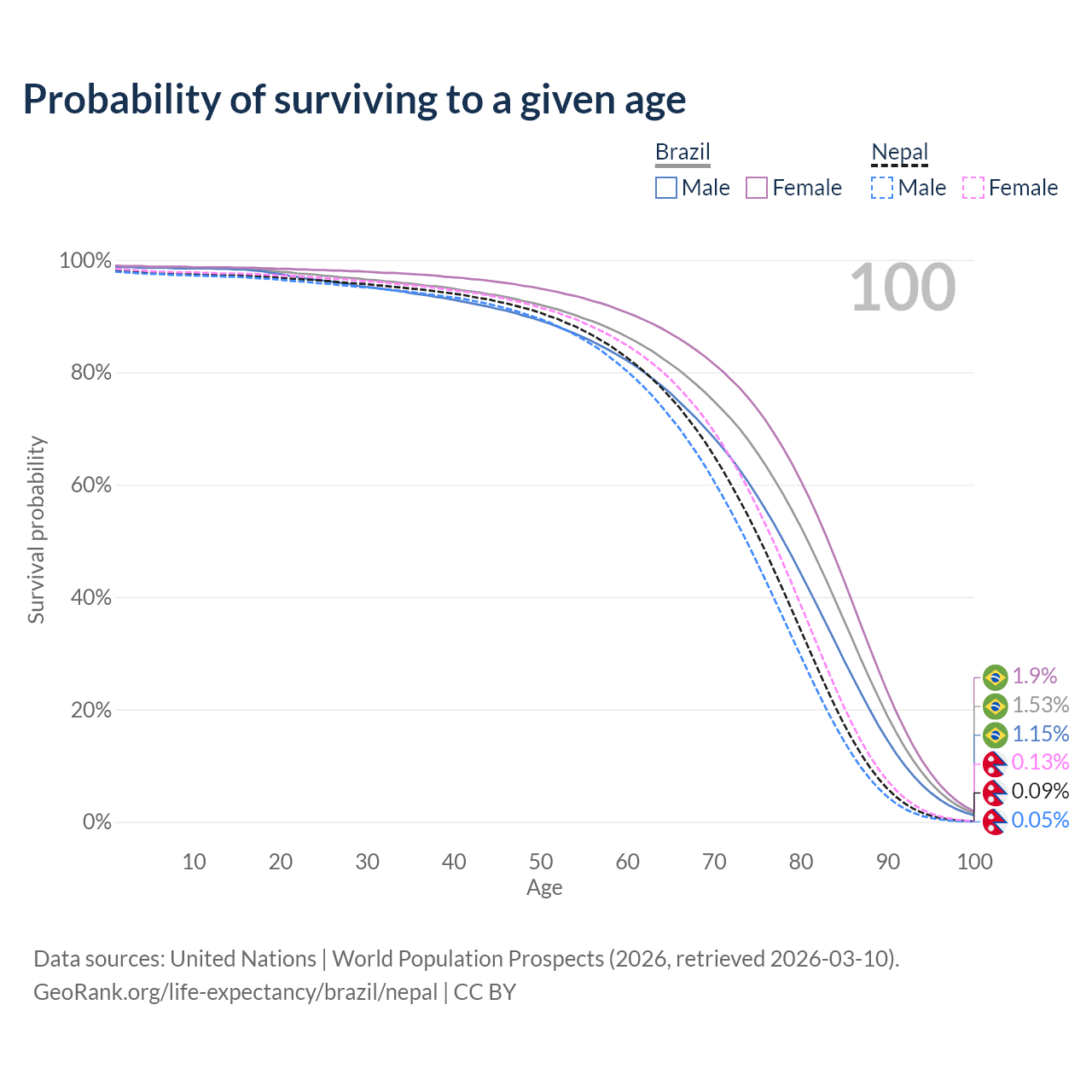 This life expectancy calculator shows the odds of living to 100, 95, 90, and below based on current age for both males and females in Brazil and Nepal, along with mean and median age of death. The calculations are based on the 2026 life tables (actuarial tables) from the UN World Population Prospects.