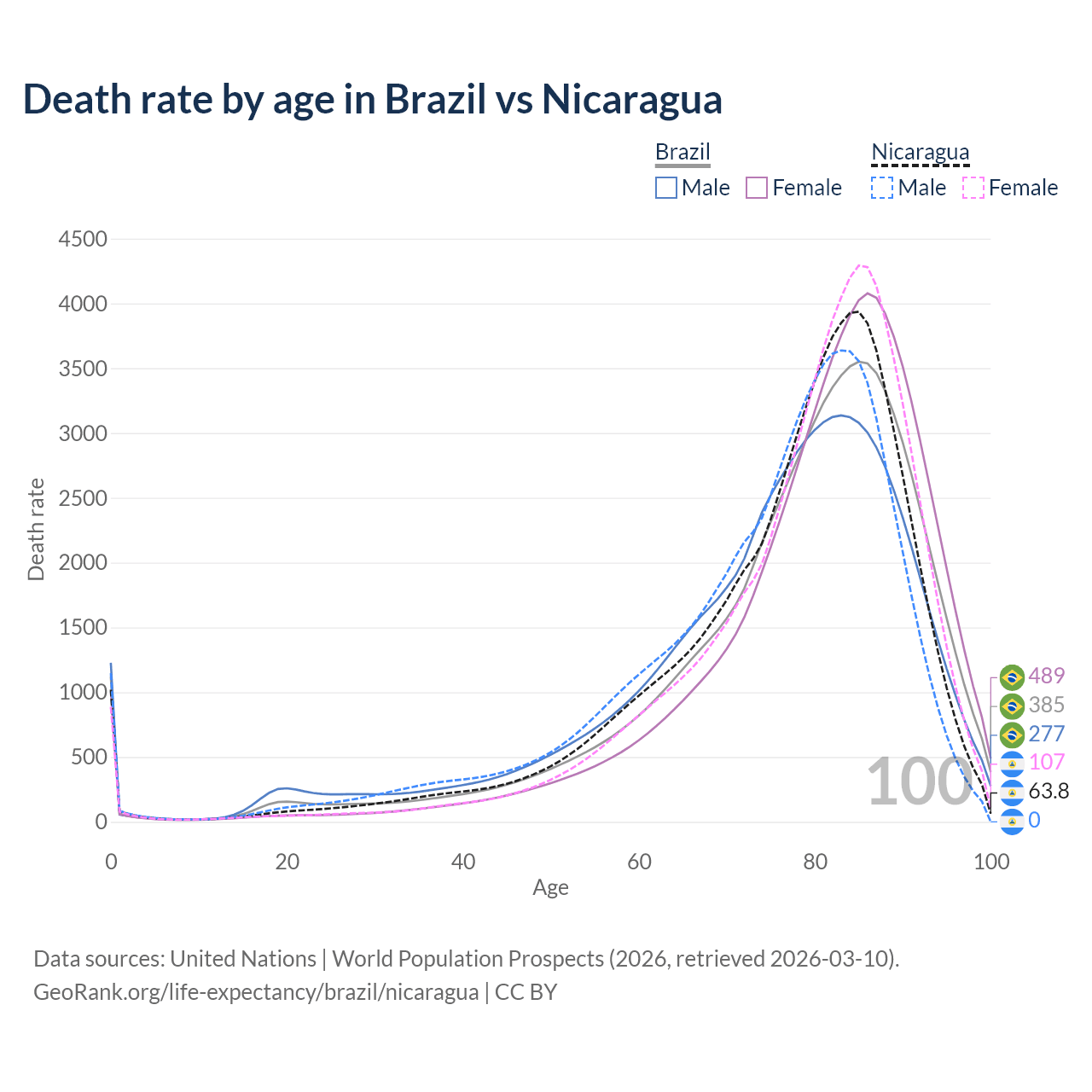 In Brazil, the most common age of death is 85, compared to 85 in Nicaragua. The median age of death is 80.8 in Brazil and 79.9 in Nicaragua, meaning only half of each cohort is expected to live past that age.