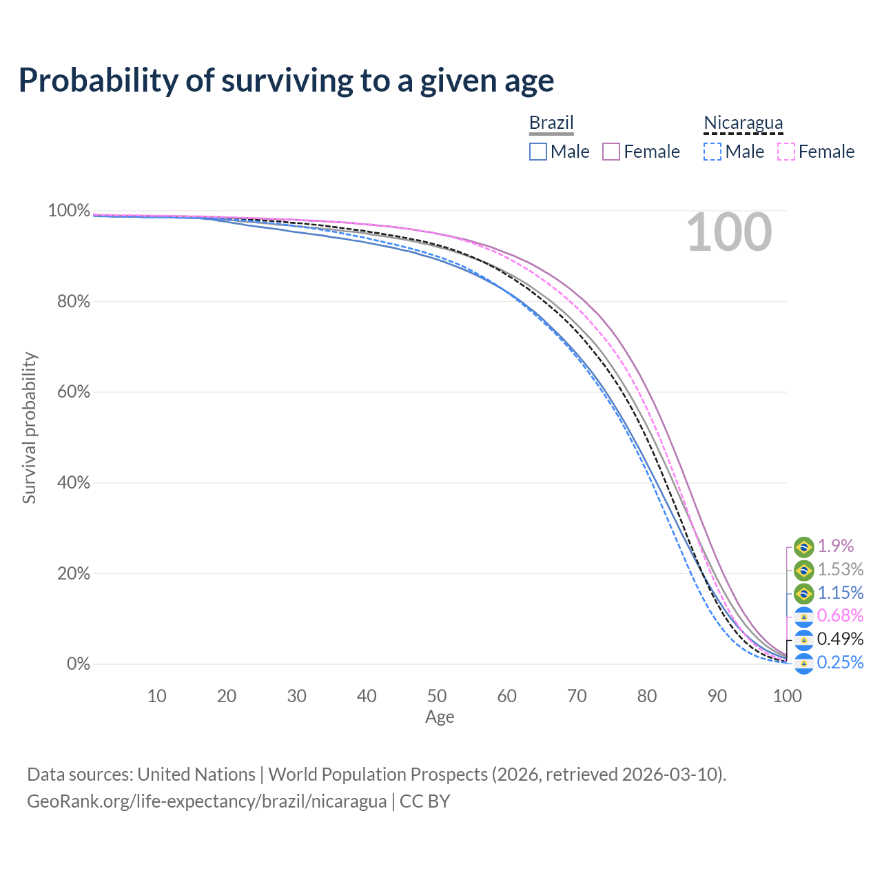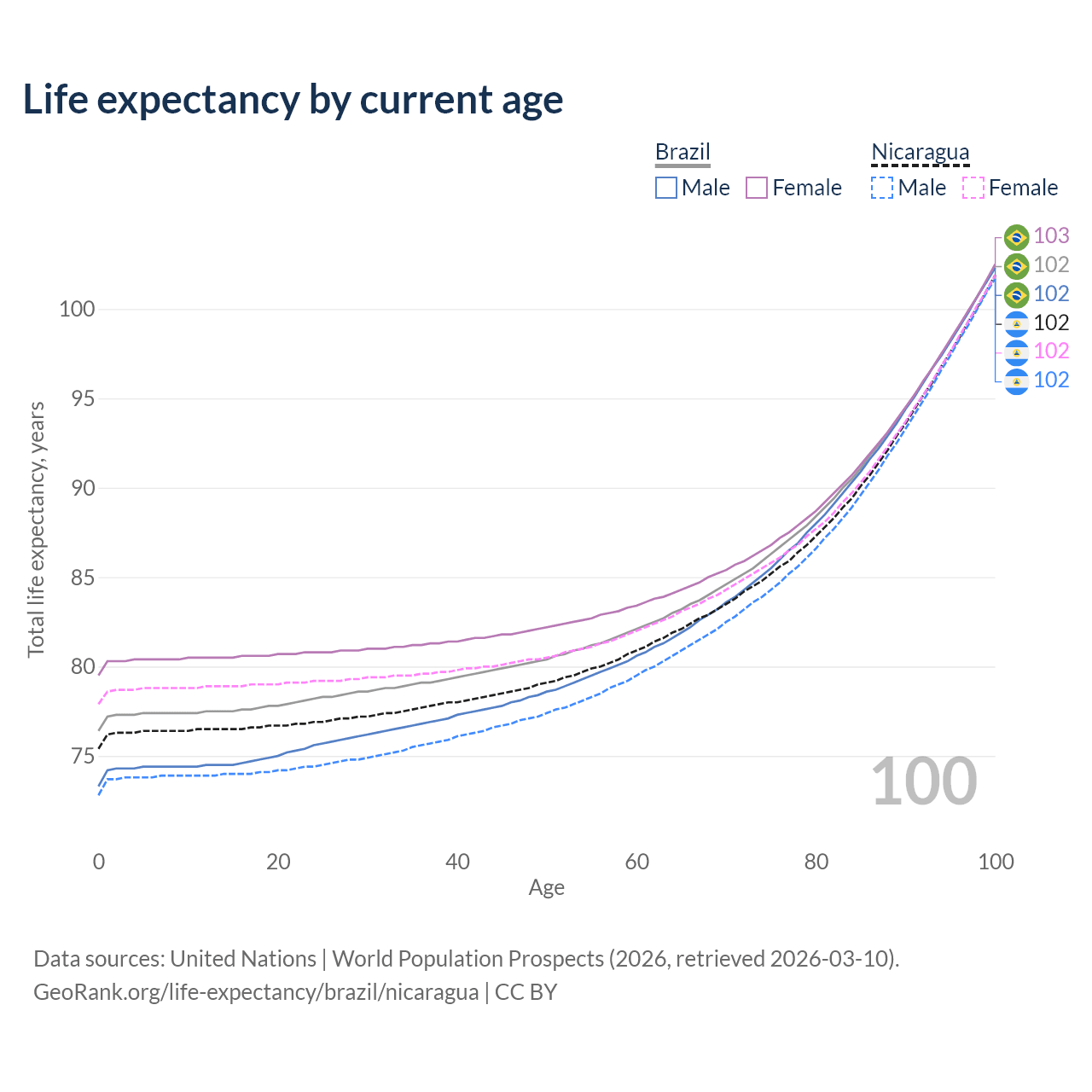 This life expectancy calculator shows the odds of living to 100, 95, 90, and below based on current age for both males and females in Brazil and Nicaragua, along with mean and median age of death. The calculations are based on the 2026 life tables (actuarial tables) from the UN World Population Prospects.