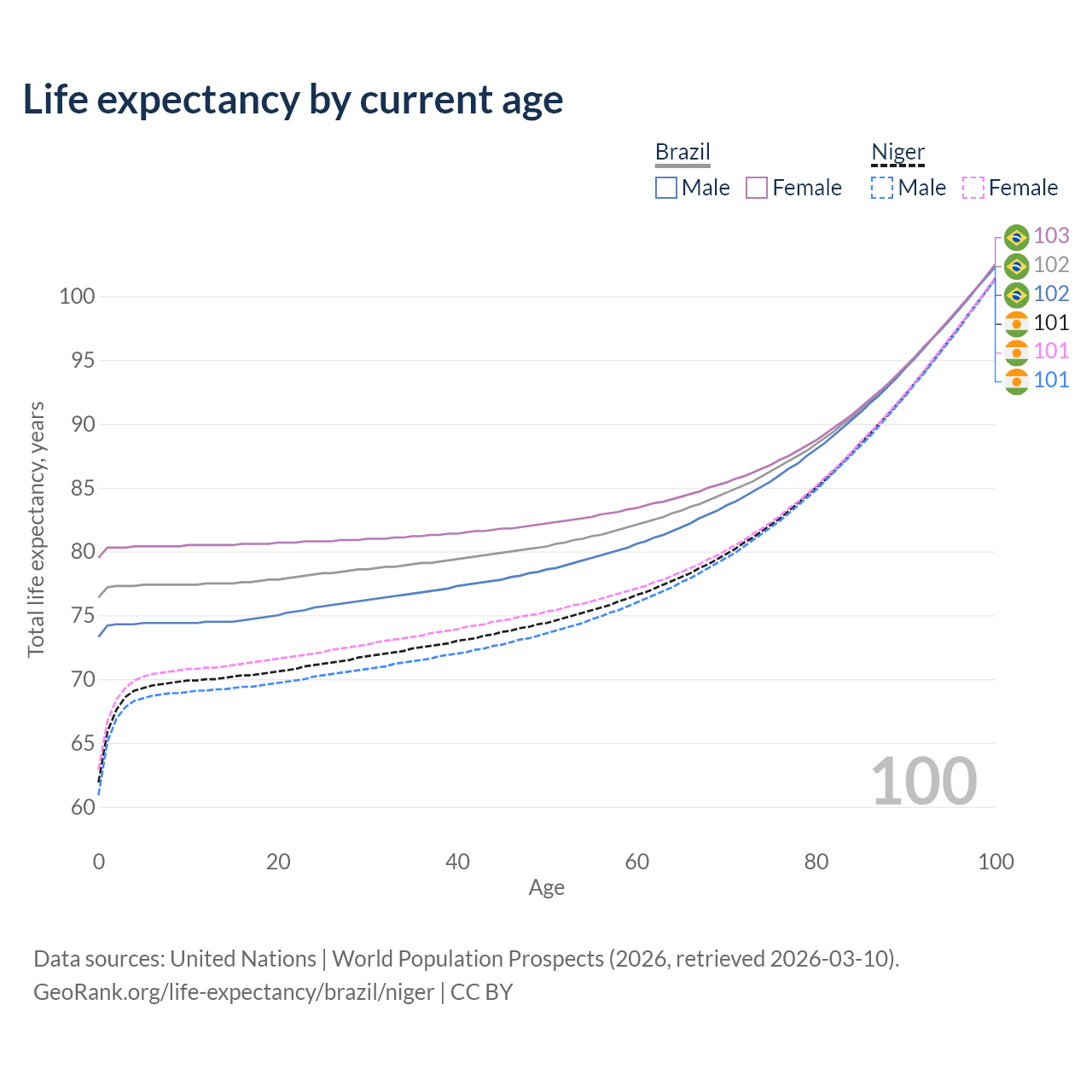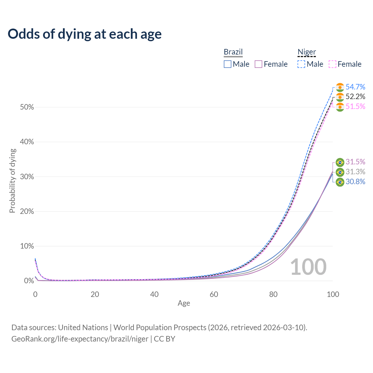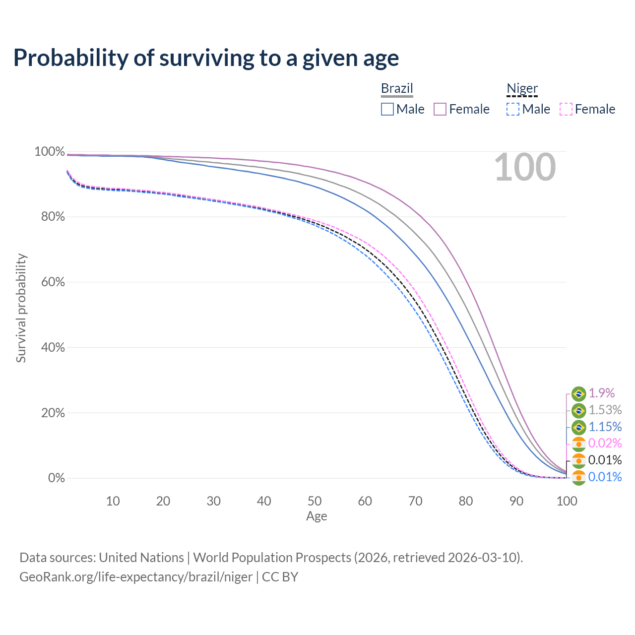 This life expectancy calculator shows the odds of living to 100, 95, 90, and below based on current age for both males and females in Brazil and Niger, along with mean and median age of death. The calculations are based on the 2026 life tables (actuarial tables) from the UN World Population Prospects.