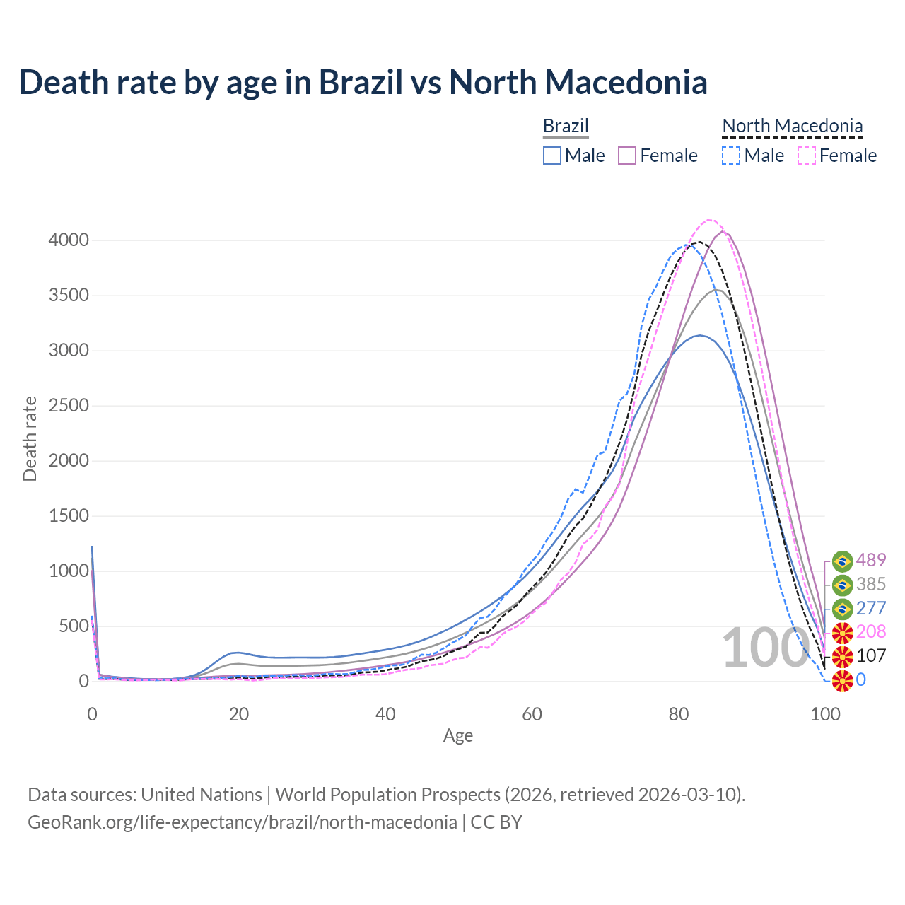 In Brazil, the most common age of death is 85, compared to 83 in North Macedonia. The median age of death is 80.8 in Brazil and 80.3 in North Macedonia, meaning only half of each cohort is expected to live past that age.