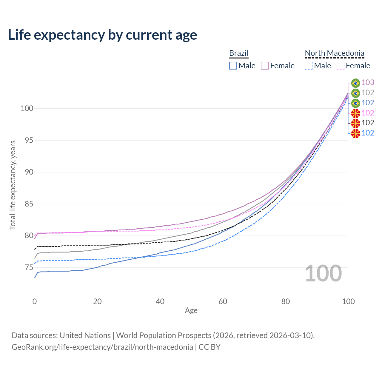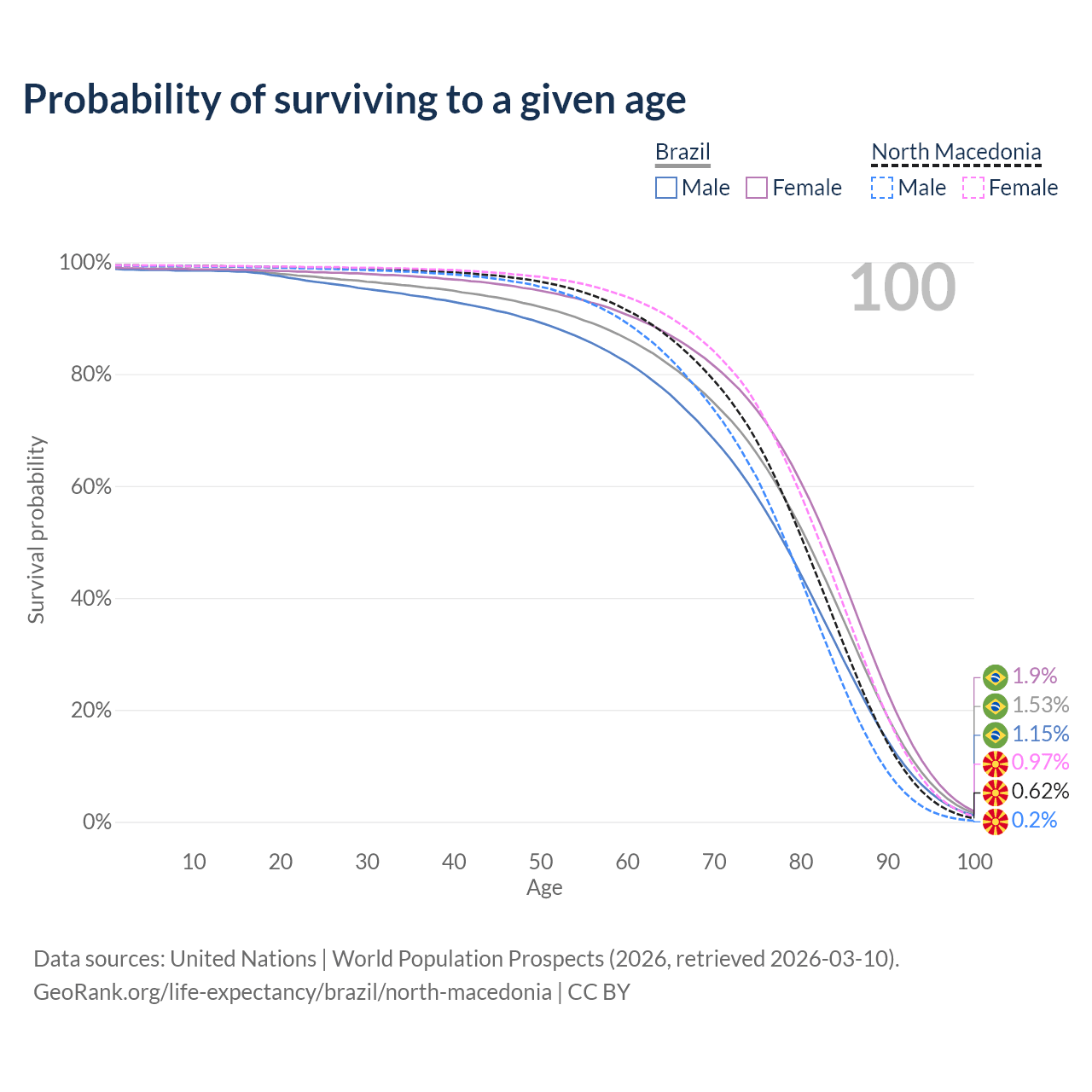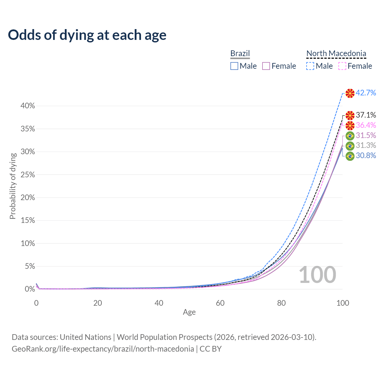 This life expectancy calculator shows the odds of living to 100, 95, 90, and below based on current age for both males and females in Brazil and North Macedonia, along with mean and median age of death. The calculations are based on the 2026 life tables (actuarial tables) from the UN World Population Prospects.