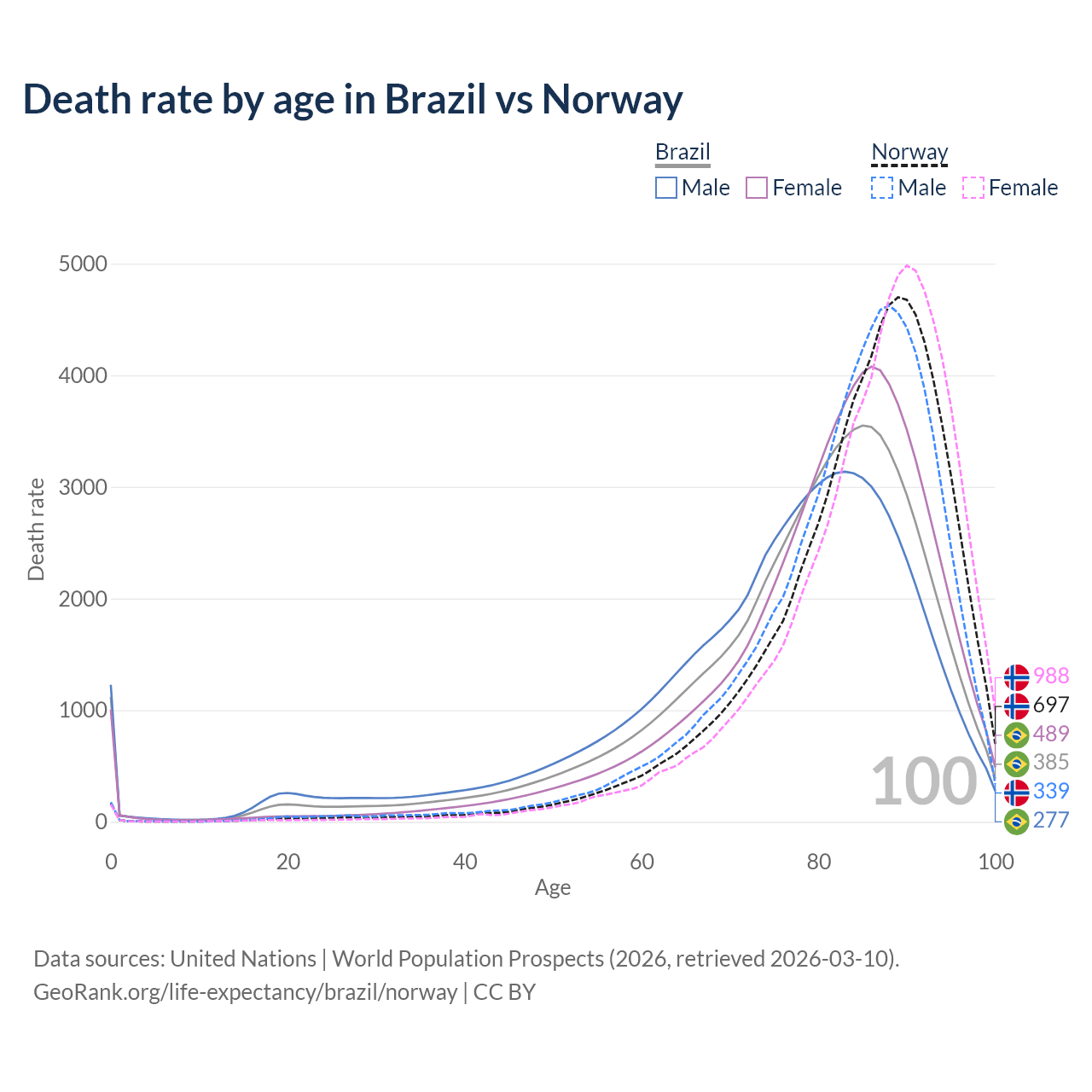 In Brazil, the most common age of death is 85, compared to 89 in Norway. The median age of death is 80.8 in Brazil and 86.5 in Norway, meaning only half of each cohort is expected to live past that age.