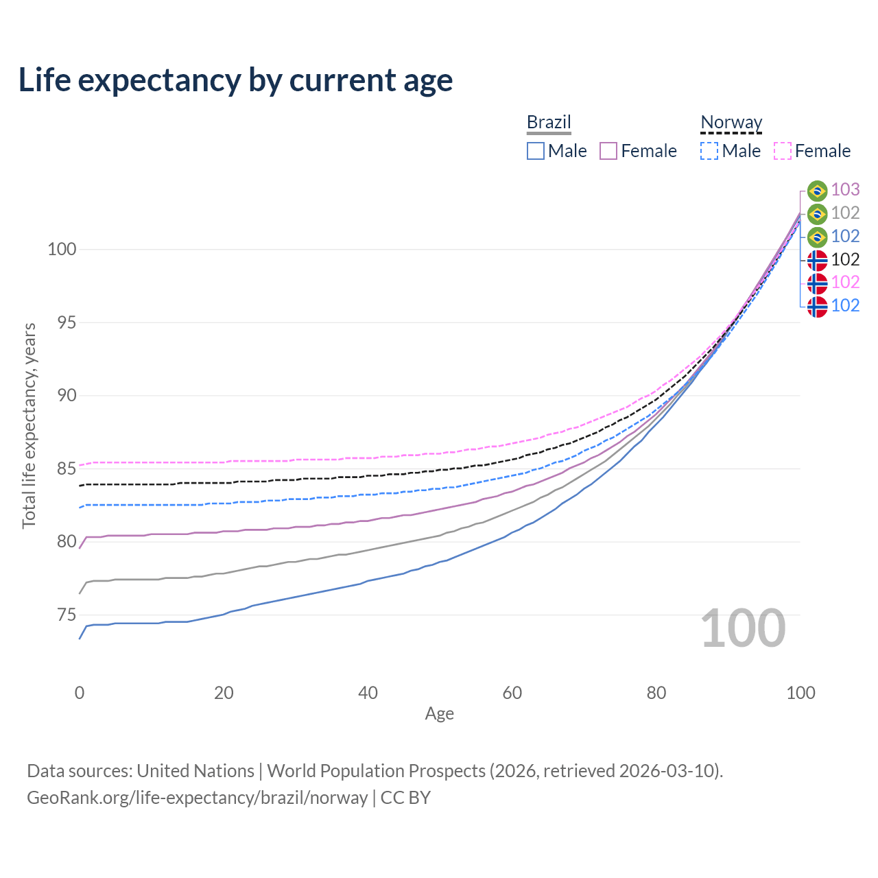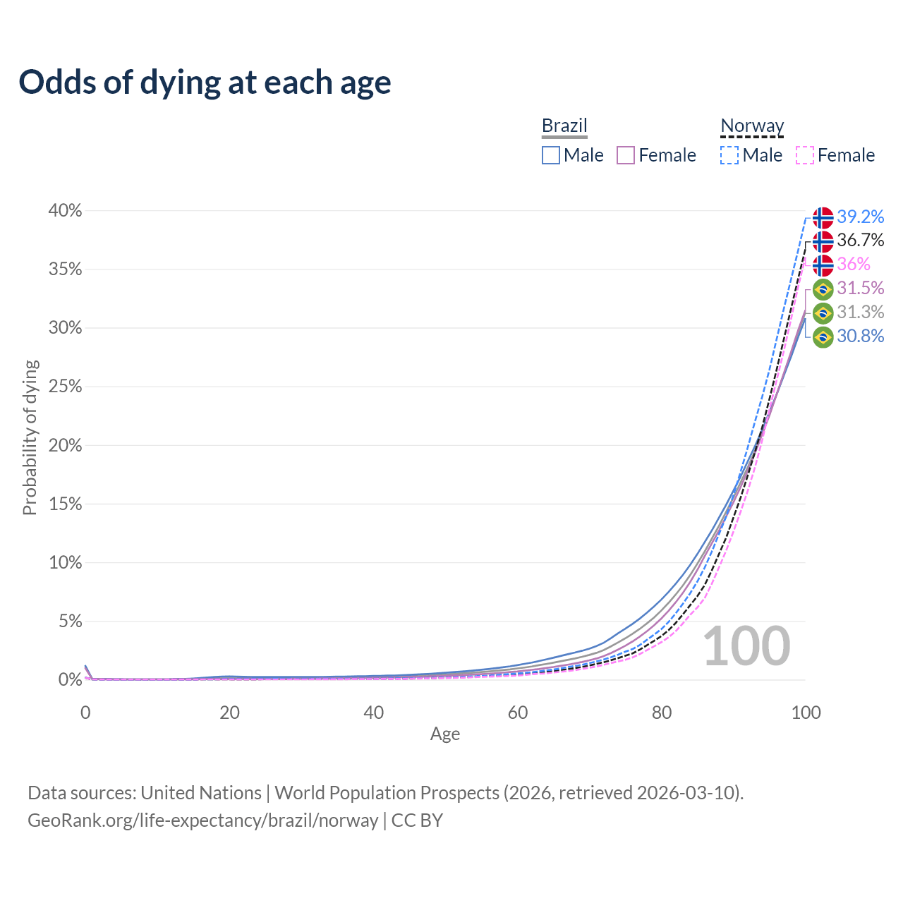 This life expectancy calculator shows the odds of living to 100, 95, 90, and below based on current age for both males and females in Brazil and Norway, along with mean and median age of death. The calculations are based on the 2026 life tables (actuarial tables) from the UN World Population Prospects.