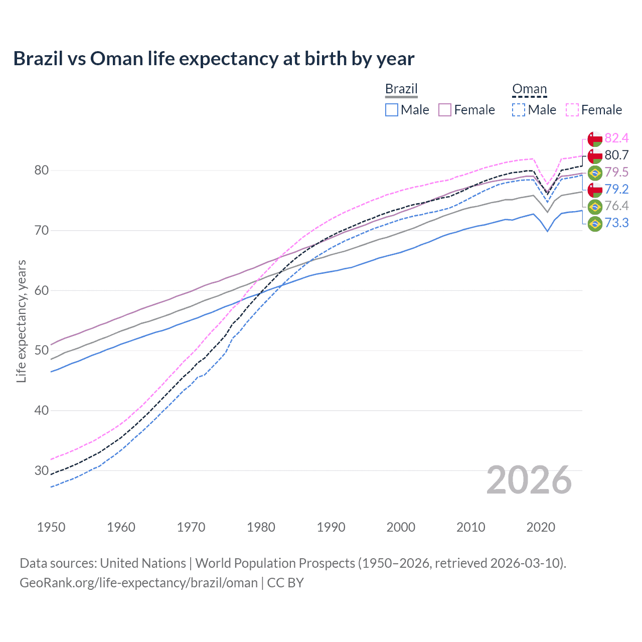 The average life expectancy at birth is 76.4 years in Brazil vs 80.7 in Oman. Brazil is ranked 82/197 by life expectancy, and Oman is 43/197. In Brazil, the life expectancy is 73.3 years for males and 79.5 years for females. In Oman, it's 79.2 years for males and 82.4 years for females.