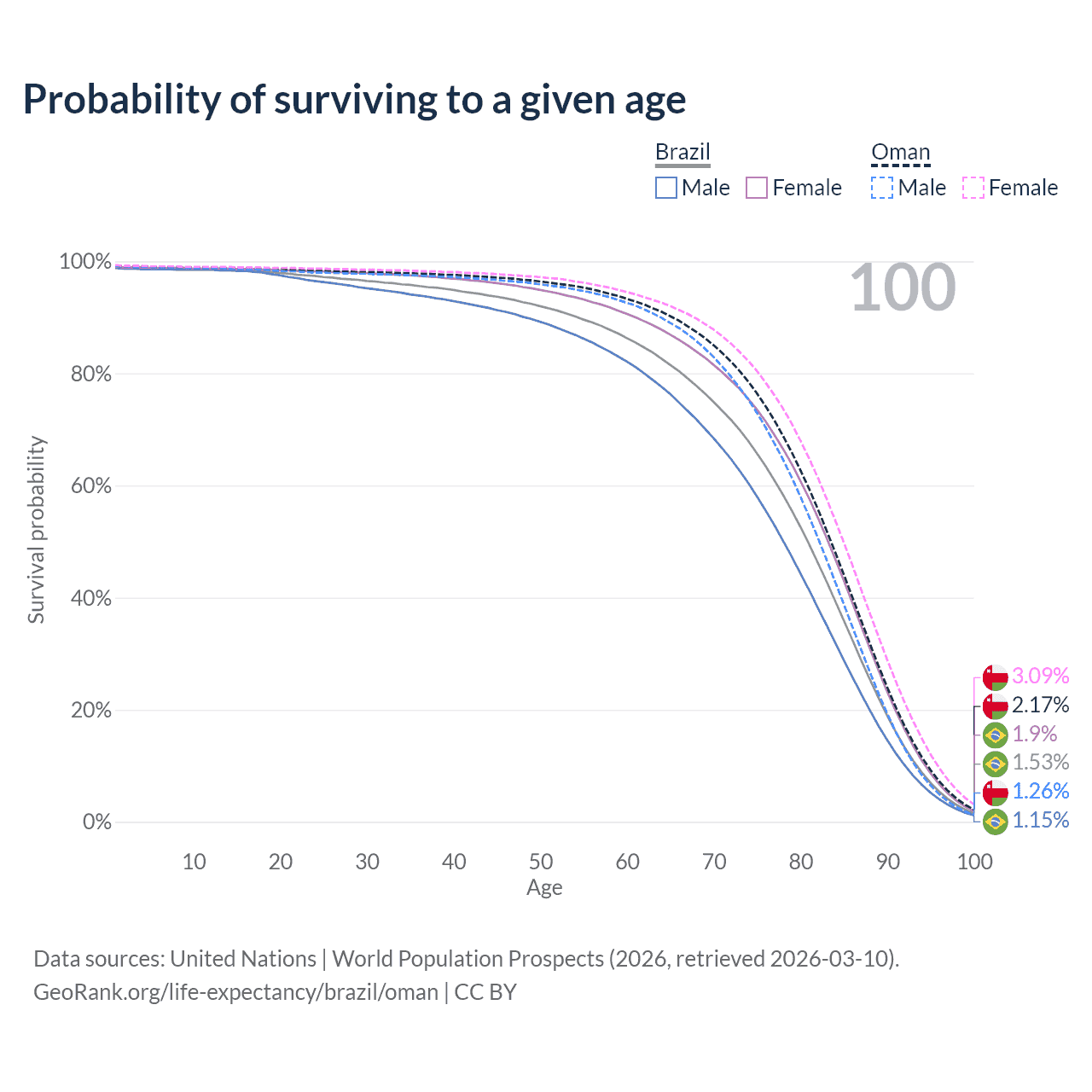 This life expectancy calculator shows the odds of living to 100, 95, 90, and below based on current age for both males and females in Brazil and Oman, along with mean and median age of death. The calculations are based on the 2026 life tables (actuarial tables) from the UN World Population Prospects.