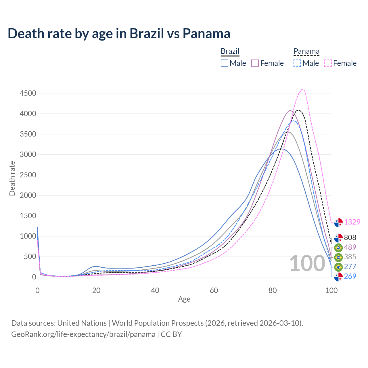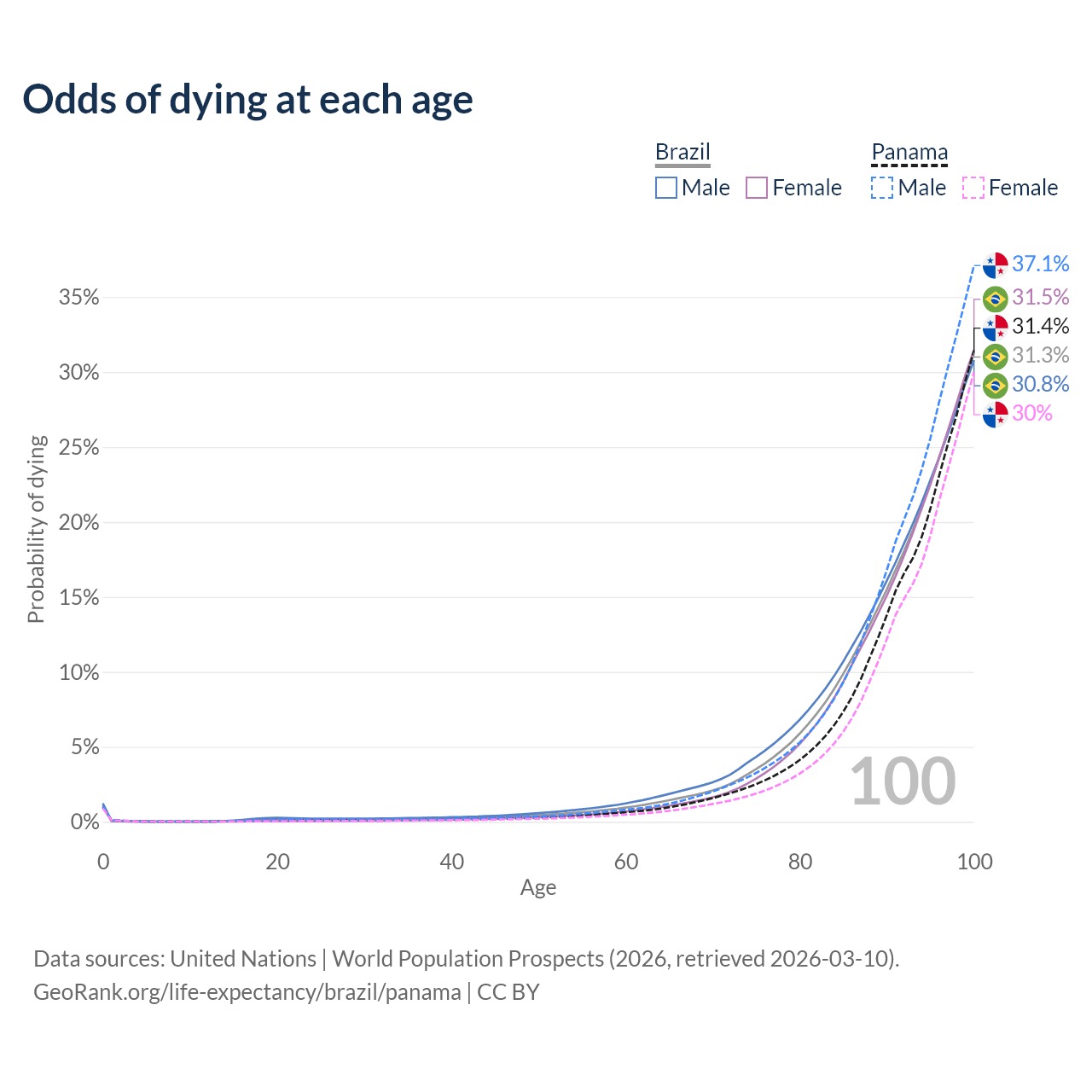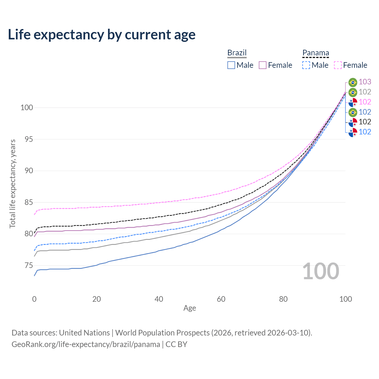This life expectancy calculator shows the odds of living to 100, 95, 90, and below based on current age for both males and females in Brazil and Panama, along with mean and median age of death. The calculations are based on the 2026 life tables (actuarial tables) from the UN World Population Prospects.