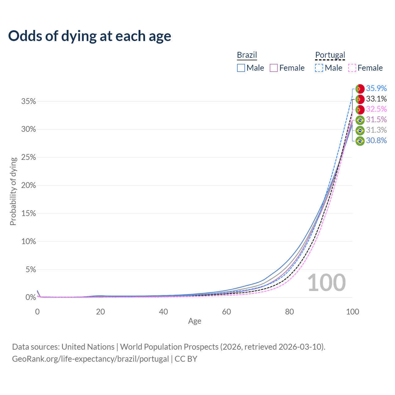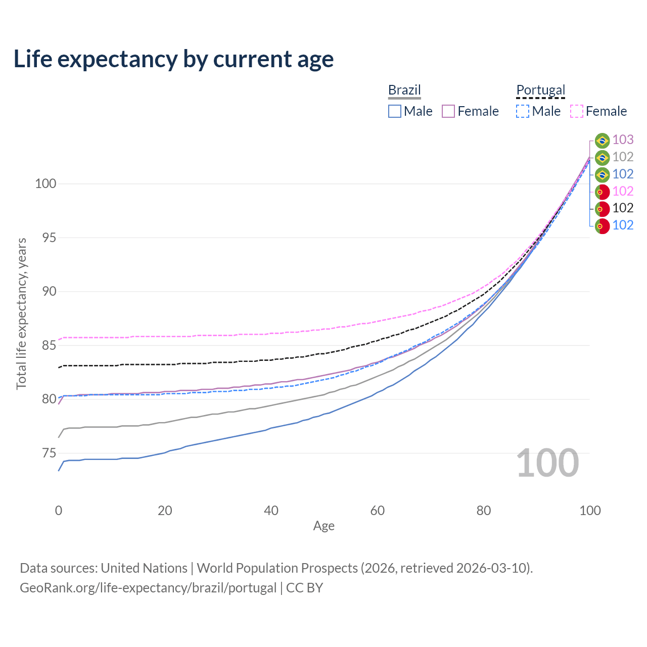This life expectancy calculator shows the odds of living to 100, 95, 90, and below based on current age for both males and females in Brazil and Portugal, along with mean and median age of death. The calculations are based on the 2026 life tables (actuarial tables) from the UN World Population Prospects.
