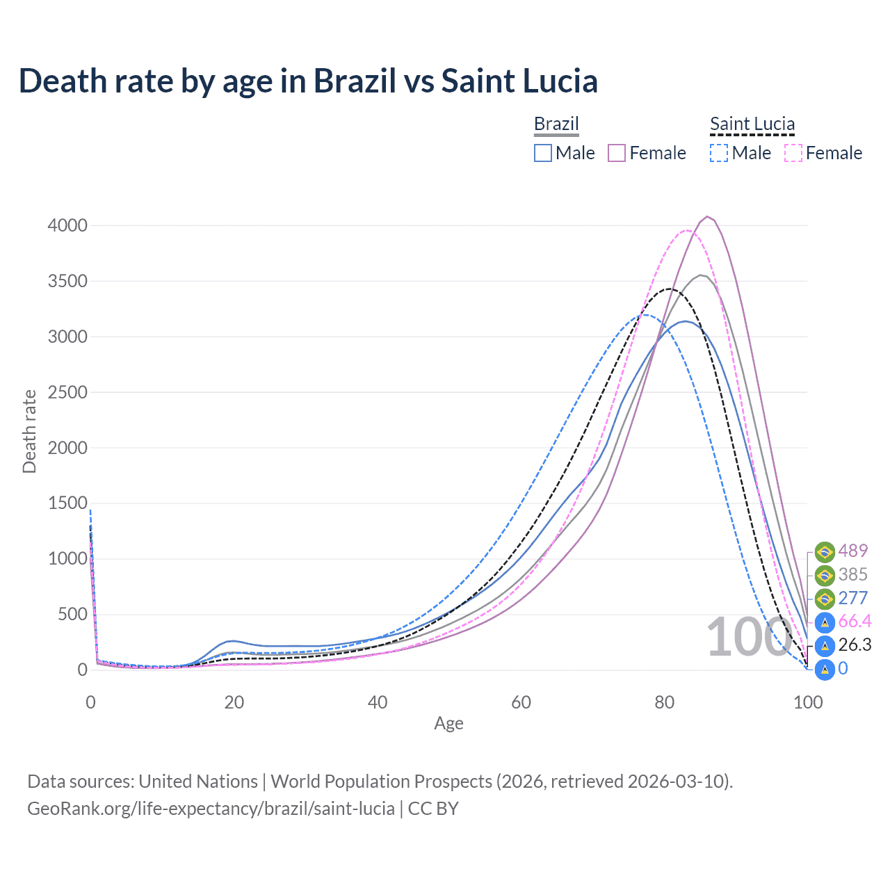 In Brazil, the most common age of death is 85, compared to 81 in Saint Lucia. The median age of death is 80.8 in Brazil and 76.8 in Saint Lucia, meaning only half of each cohort is expected to live past that age.