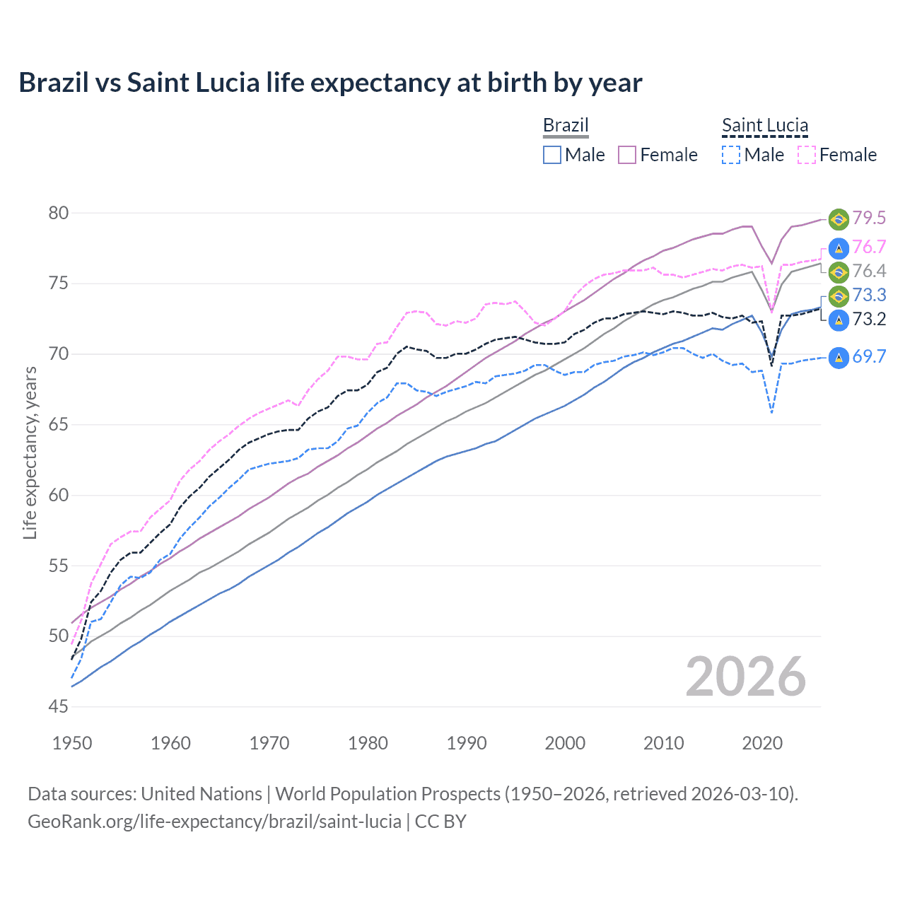 The average life expectancy at birth is 76.4 years in Brazil vs 73.2 in Saint Lucia. Brazil is ranked 82/197 by life expectancy, and Saint Lucia is 112/197. In Brazil, the life expectancy is 73.3 years for males and 79.5 years for females. In Saint Lucia, it's 69.7 years for males and 76.7 years for females.