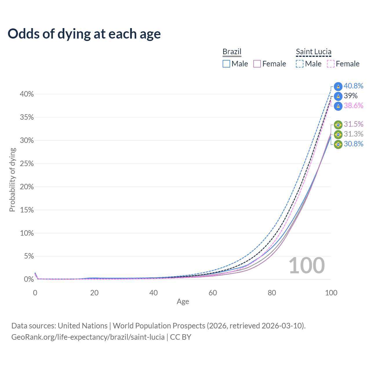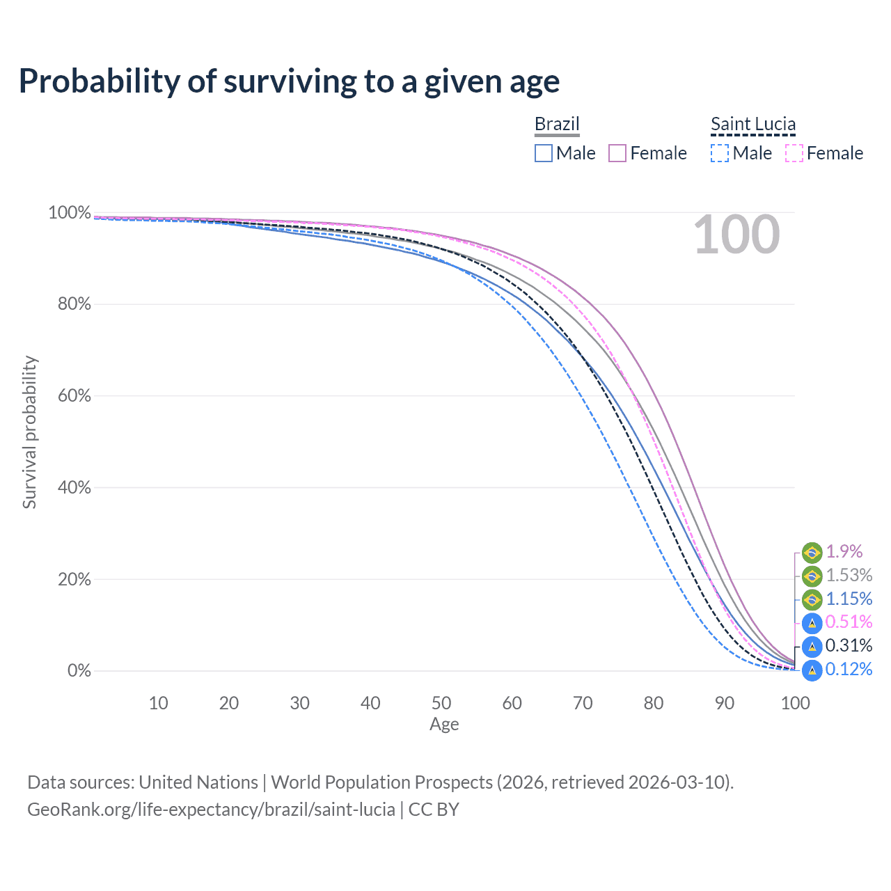 This life expectancy calculator shows the odds of living to 100, 95, 90, and below based on current age for both males and females in Brazil and Saint Lucia, along with mean and median age of death. The calculations are based on the 2026 life tables (actuarial tables) from the UN World Population Prospects.