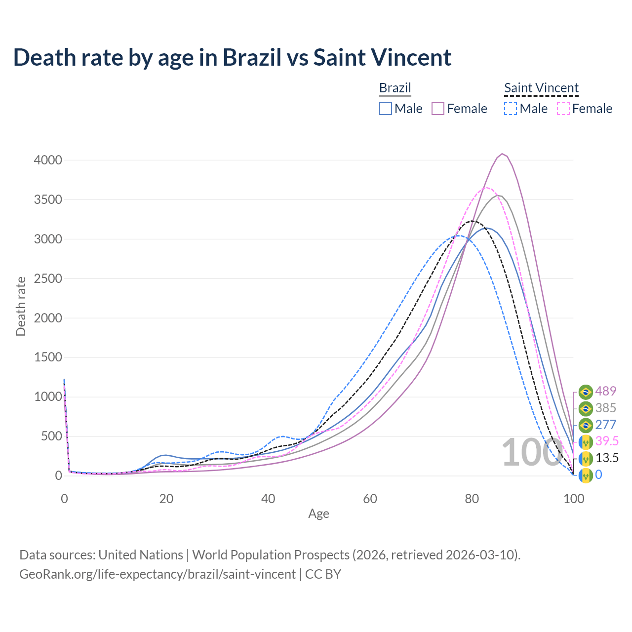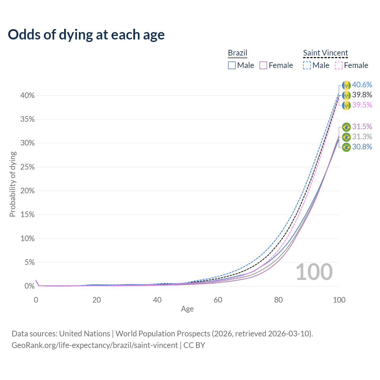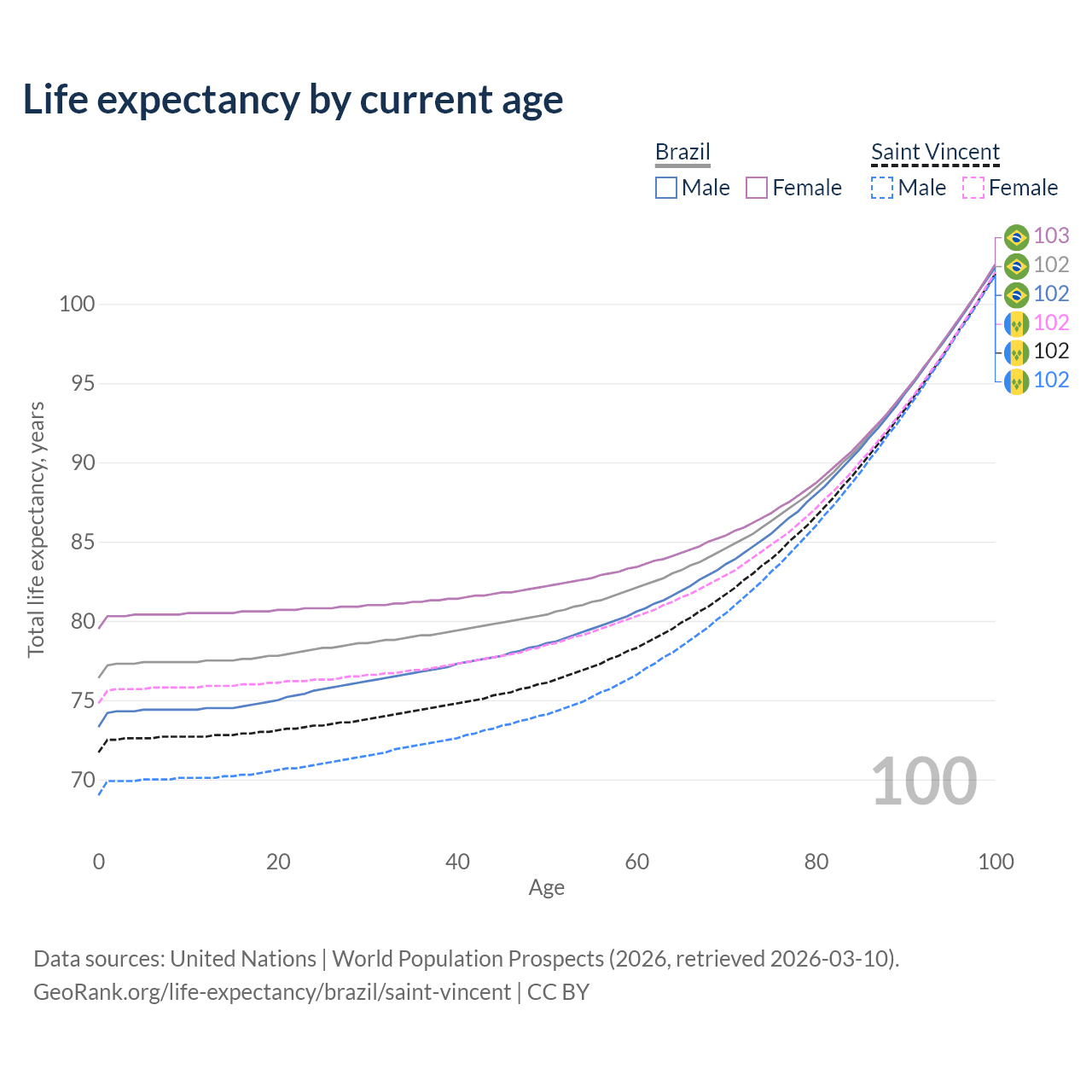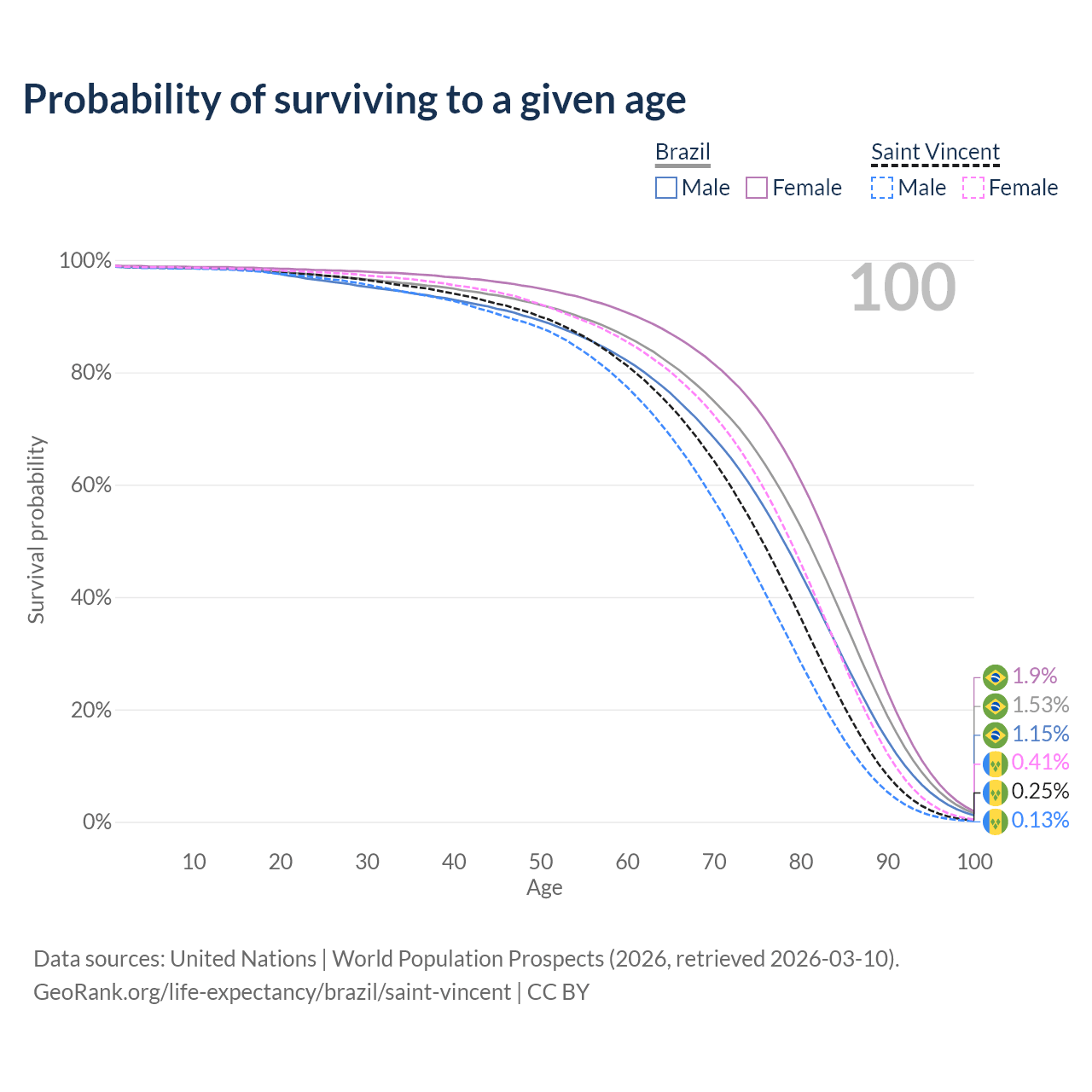 This life expectancy calculator shows the odds of living to 100, 95, 90, and below based on current age for both males and females in Brazil and Saint Vincent, along with mean and median age of death. The calculations are based on the 2026 life tables (actuarial tables) from the UN World Population Prospects.