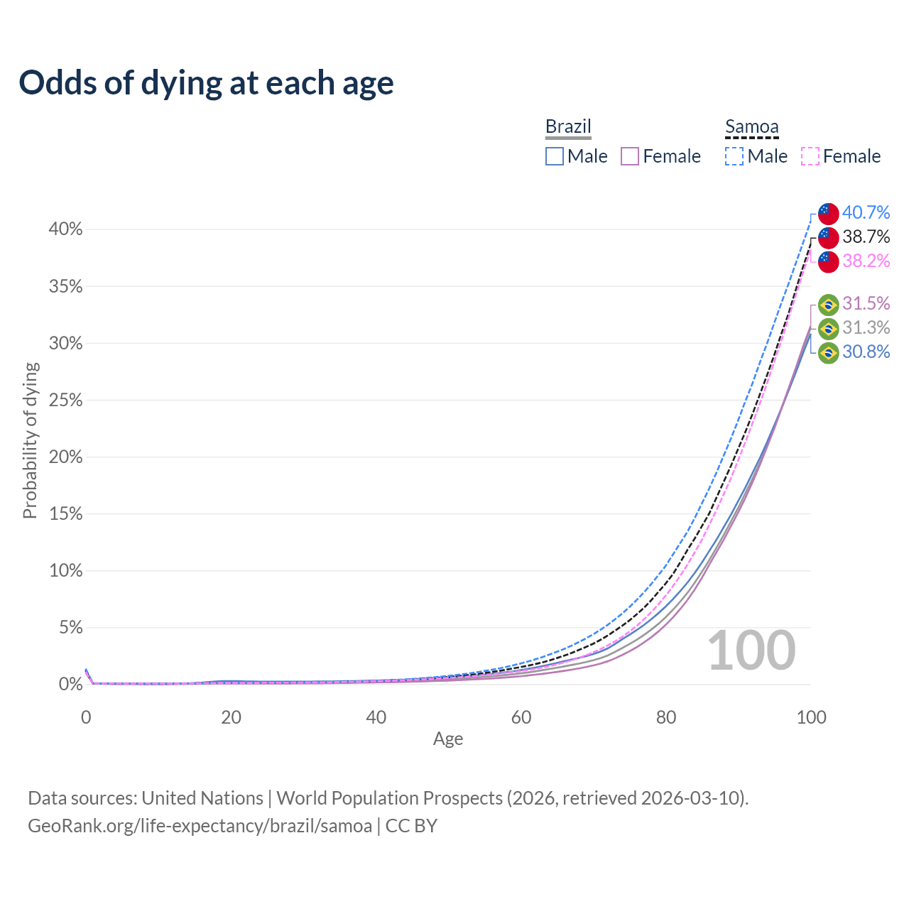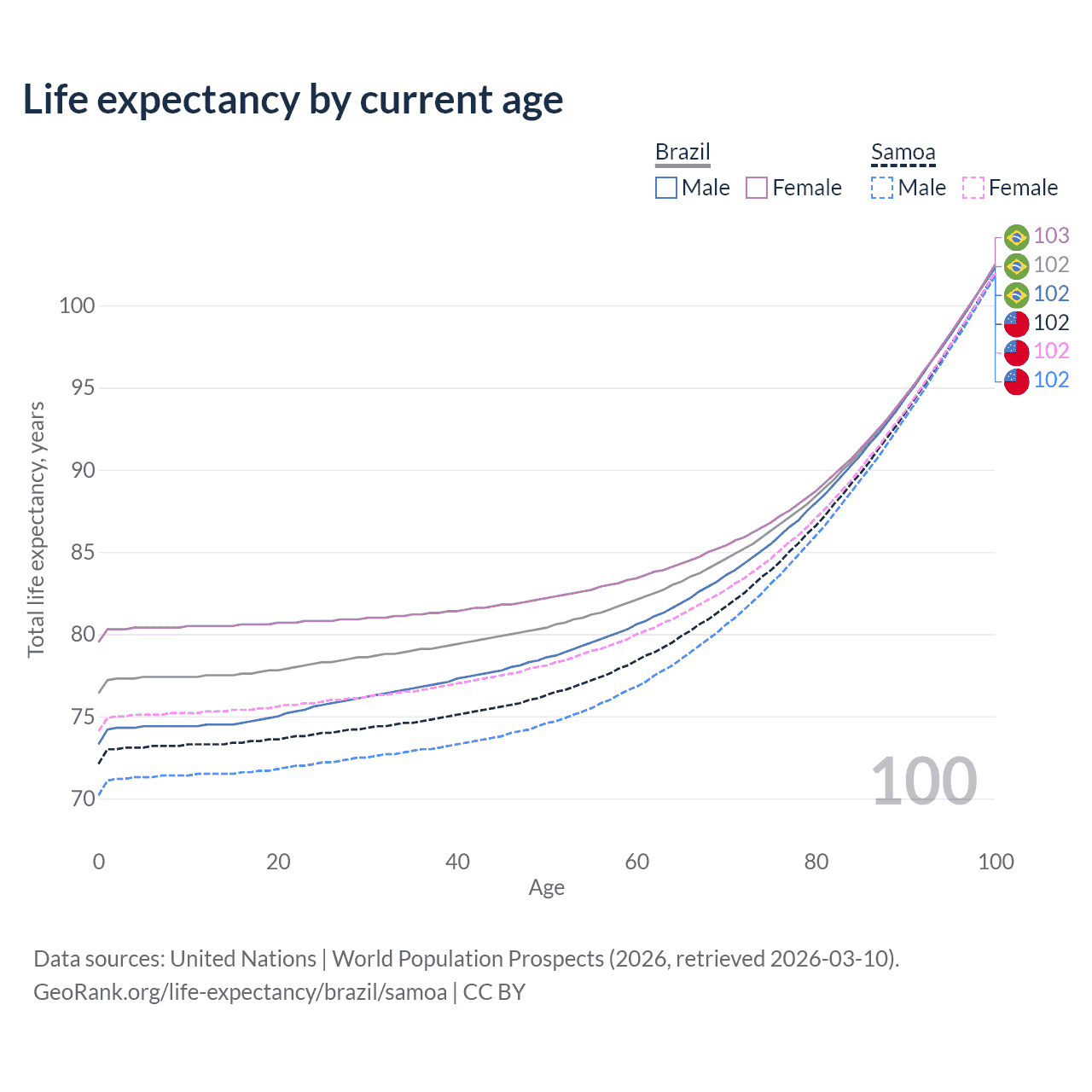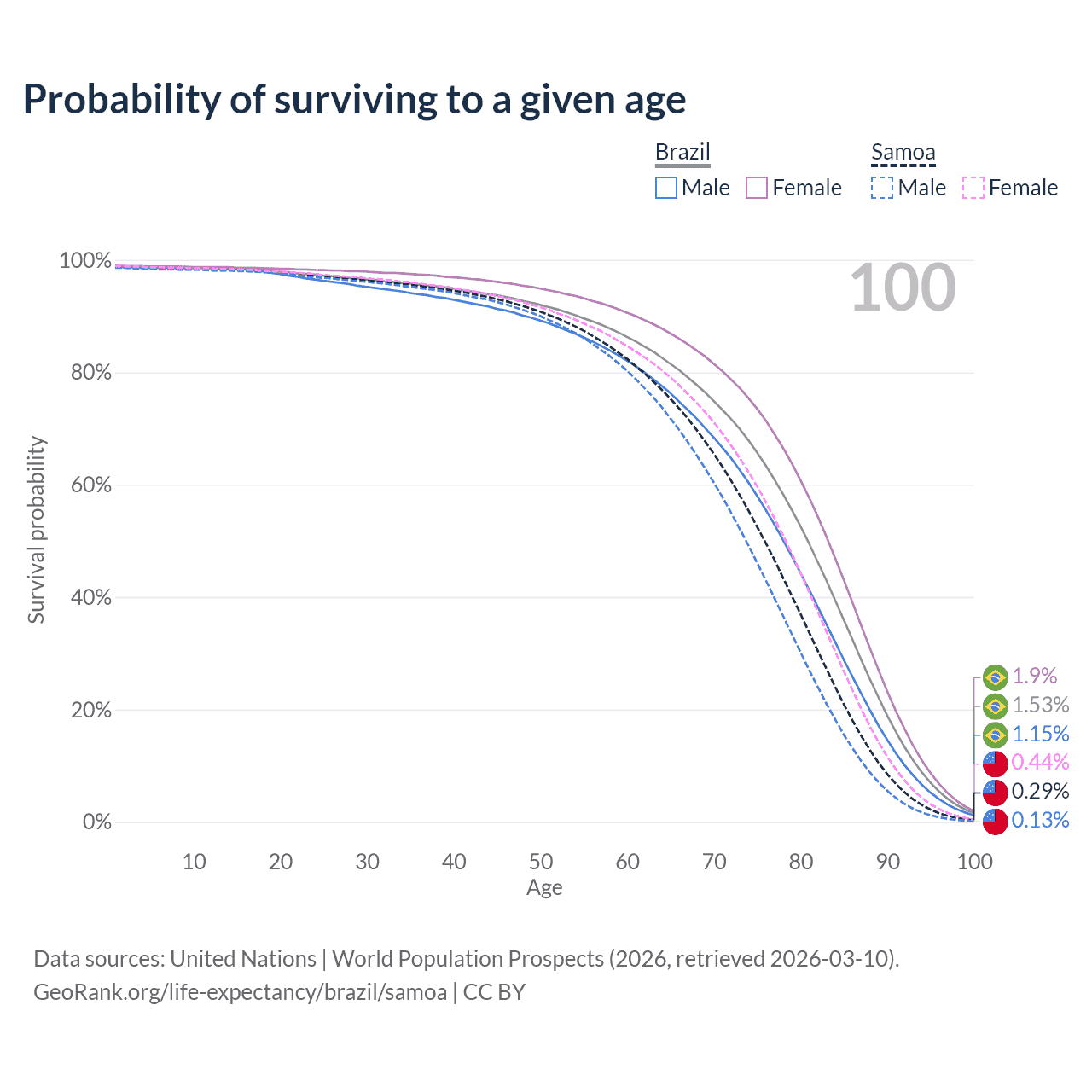This life expectancy calculator shows the odds of living to 100, 95, 90, and below based on current age for both males and females in Brazil and Samoa, along with mean and median age of death. The calculations are based on the 2026 life tables (actuarial tables) from the UN World Population Prospects.