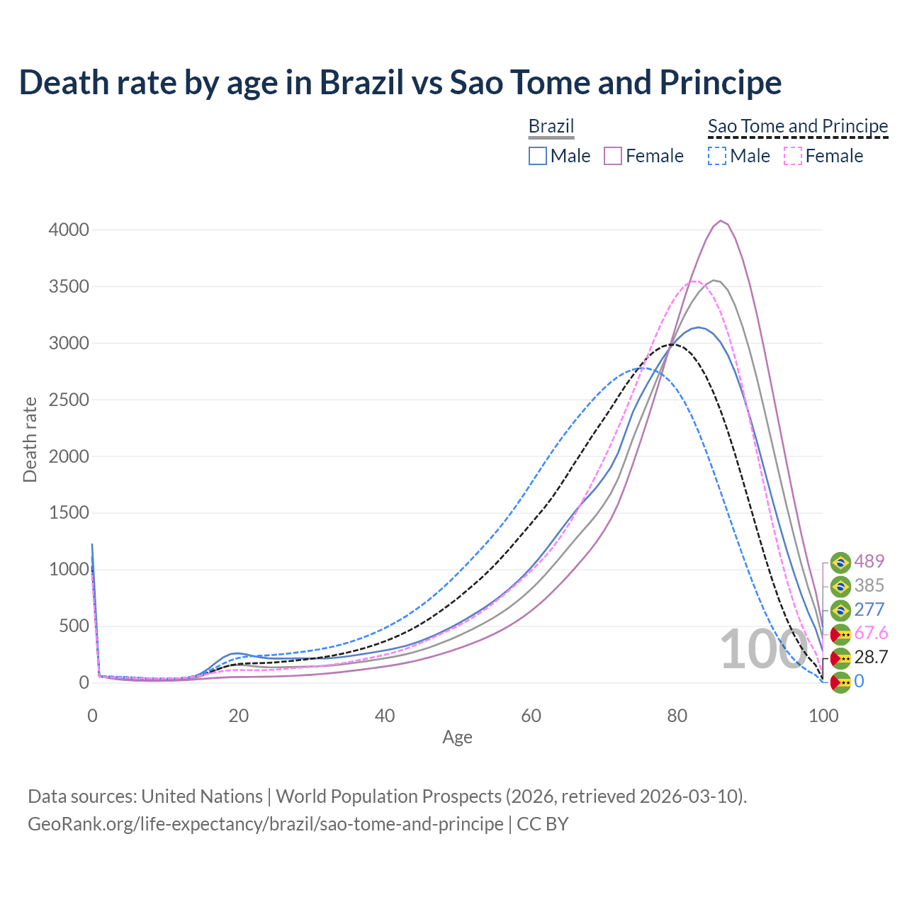 In Brazil, the most common age of death is 85, compared to 79 in Sao Tome and Principe. The median age of death is 80.8 in Brazil and 74.1 in Sao Tome and Principe, meaning only half of each cohort is expected to live past that age.