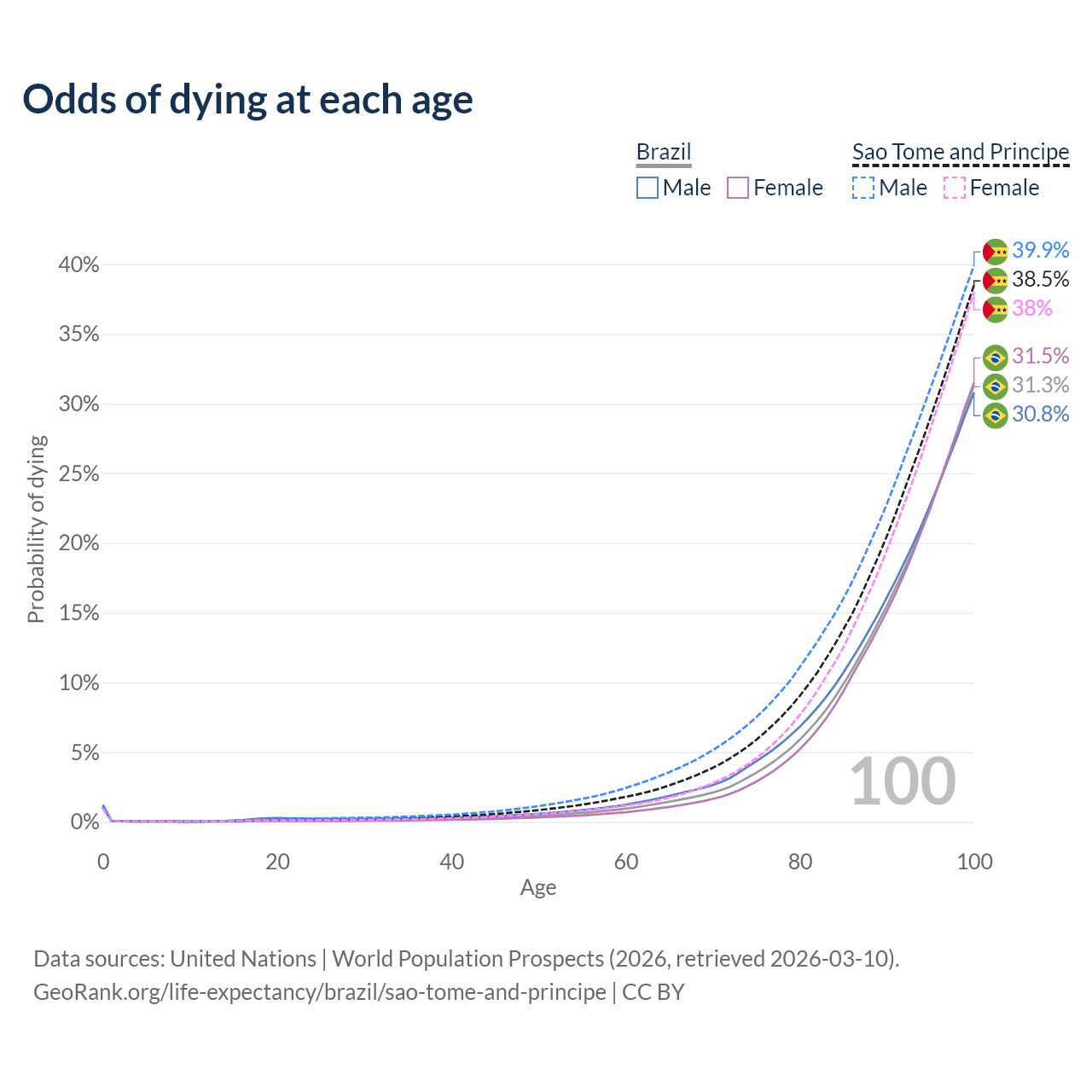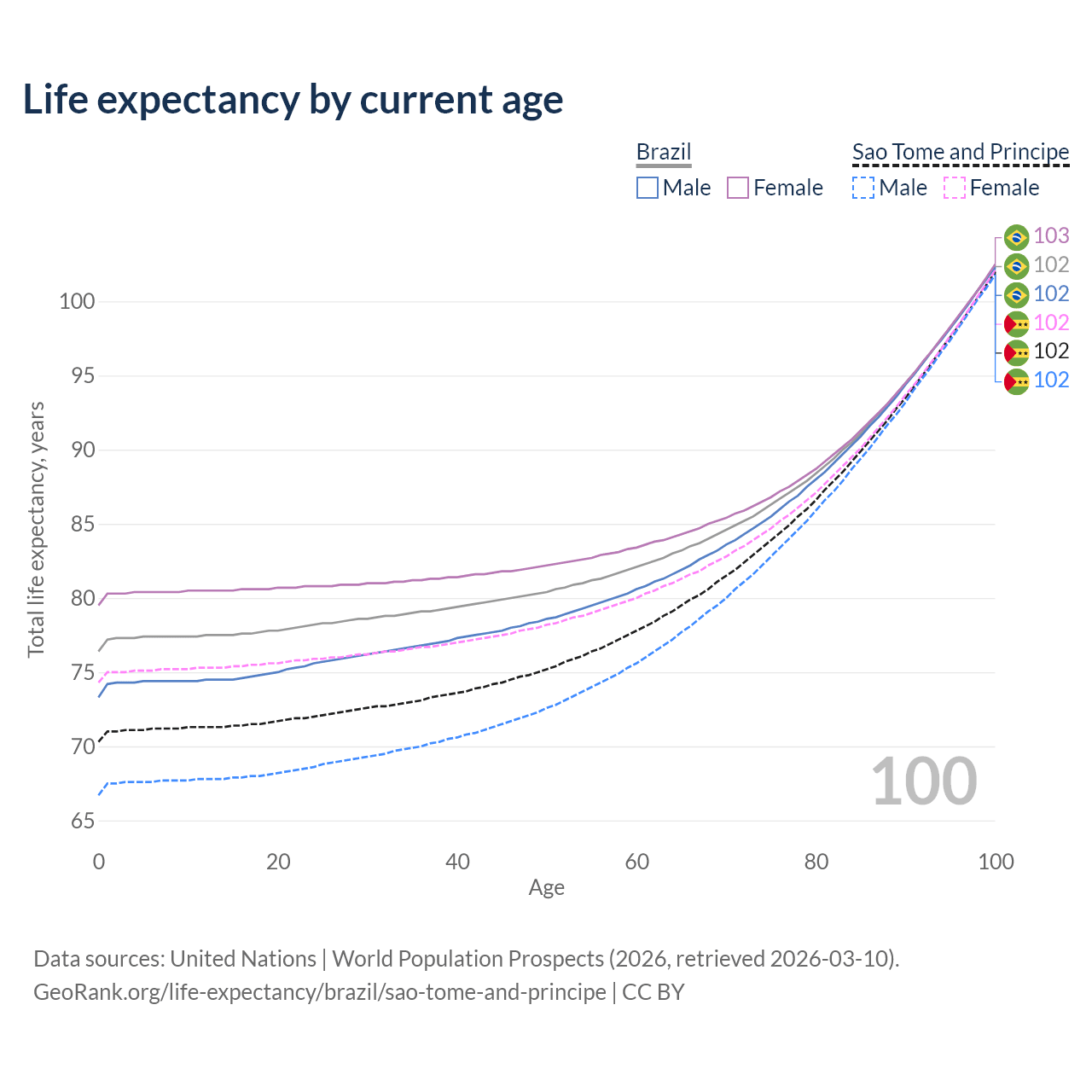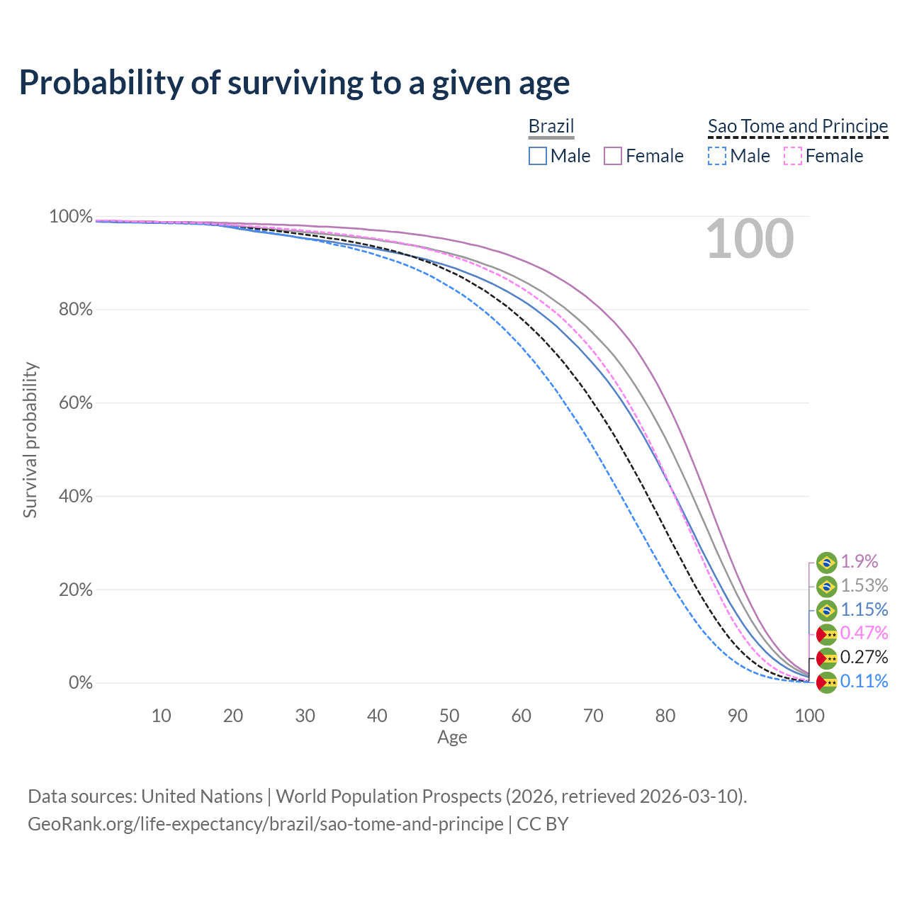 This life expectancy calculator shows the odds of living to 100, 95, 90, and below based on current age for both males and females in Brazil and Sao Tome and Principe, along with mean and median age of death. The calculations are based on the 2026 life tables (actuarial tables) from the UN World Population Prospects.
