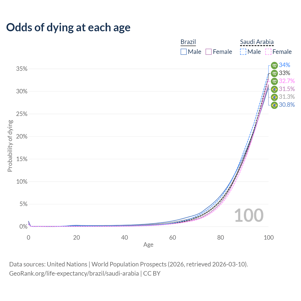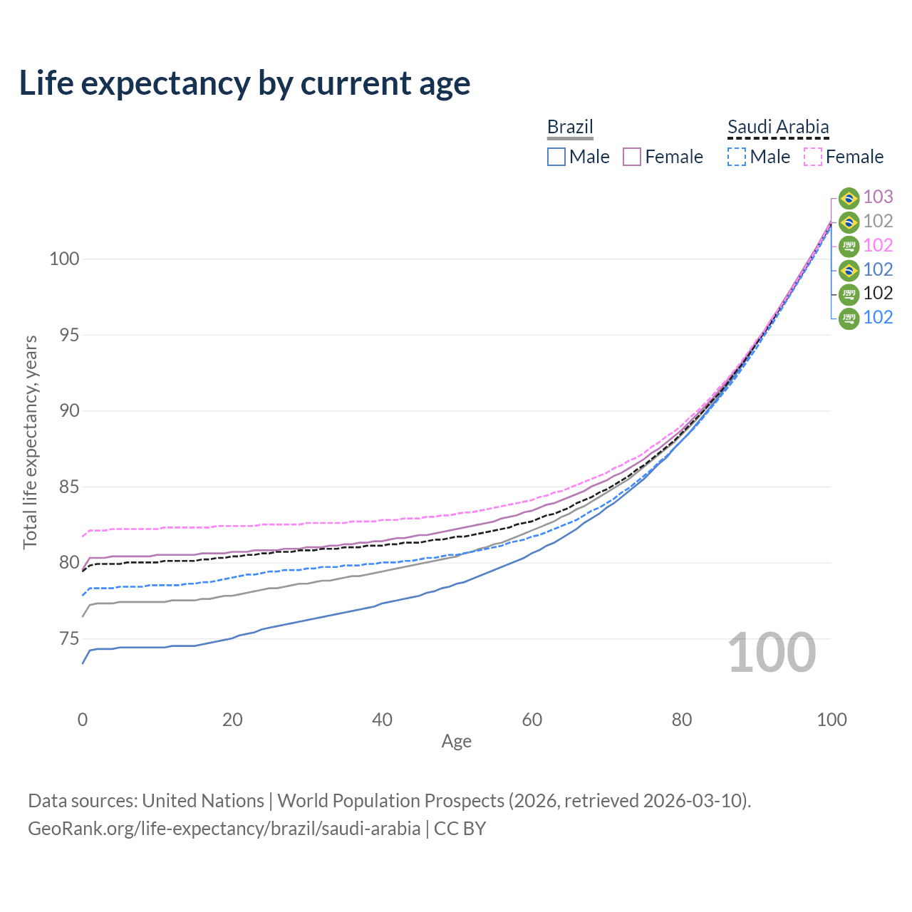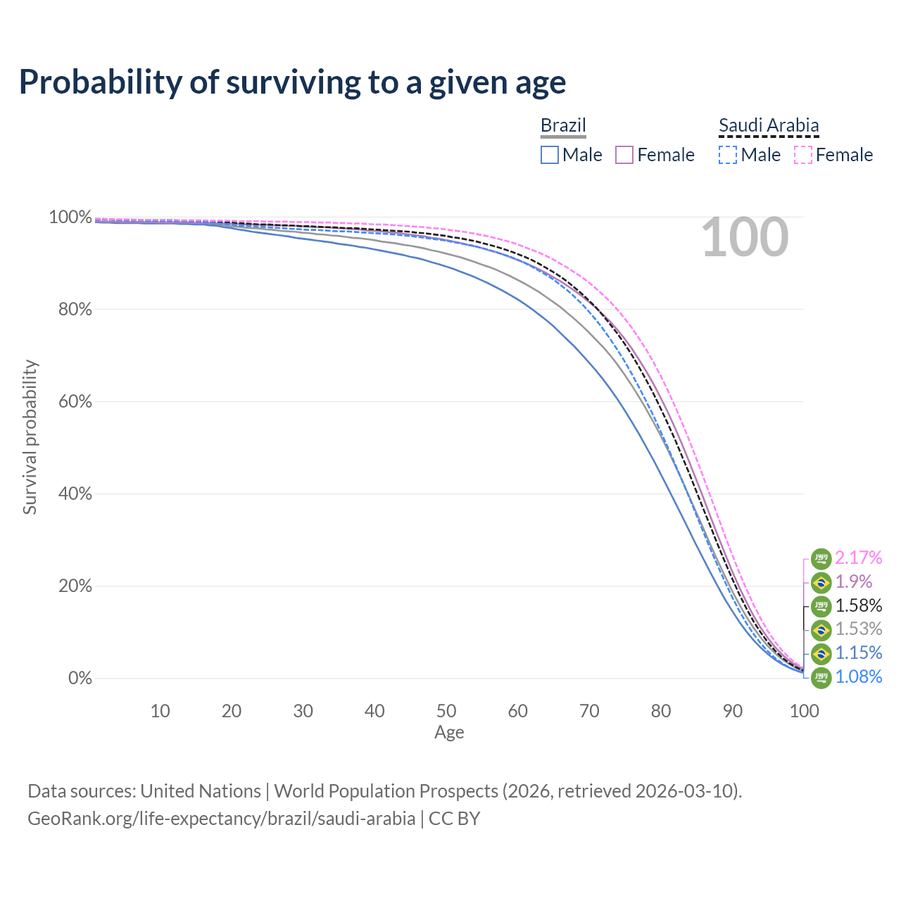 This life expectancy calculator shows the odds of living to 100, 95, 90, and below based on current age for both males and females in Brazil and Saudi Arabia, along with mean and median age of death. The calculations are based on the 2026 life tables (actuarial tables) from the UN World Population Prospects.