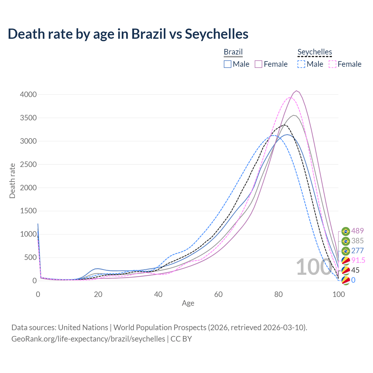 In Brazil, the most common age of death is 85, compared to 82 in the Seychelles. The median age of death is 80.8 in Brazil and 77 in the Seychelles, meaning only half of each cohort is expected to live past that age.
