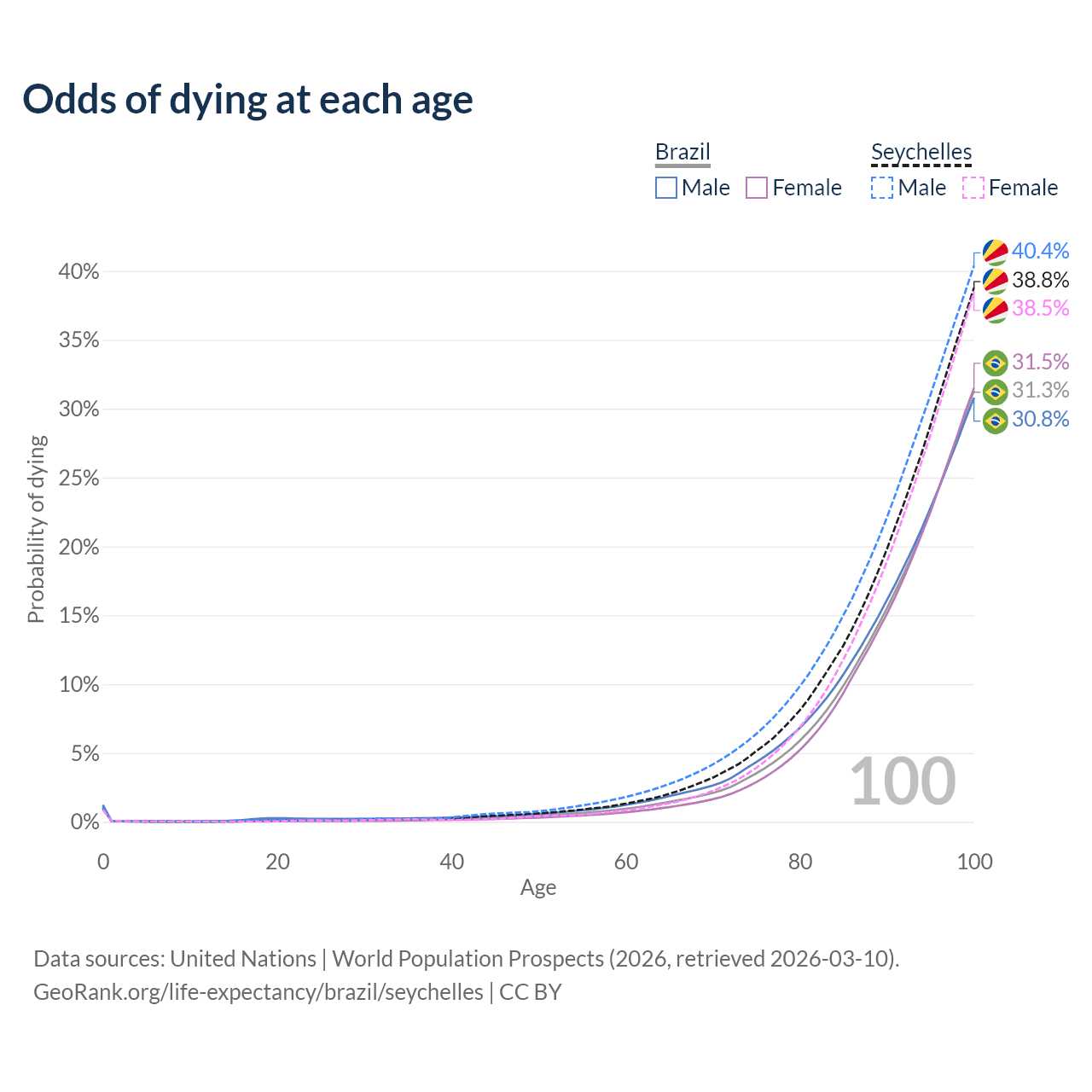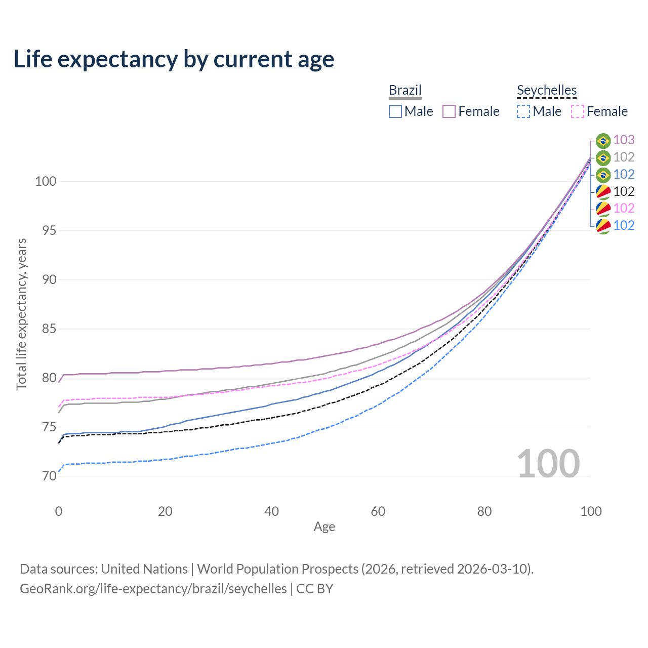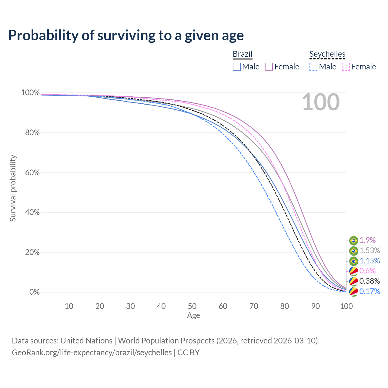 This life expectancy calculator shows the odds of living to 100, 95, 90, and below based on current age for both males and females in Brazil and the Seychelles, along with mean and median age of death. The calculations are based on the 2026 life tables (actuarial tables) from the UN World Population Prospects.