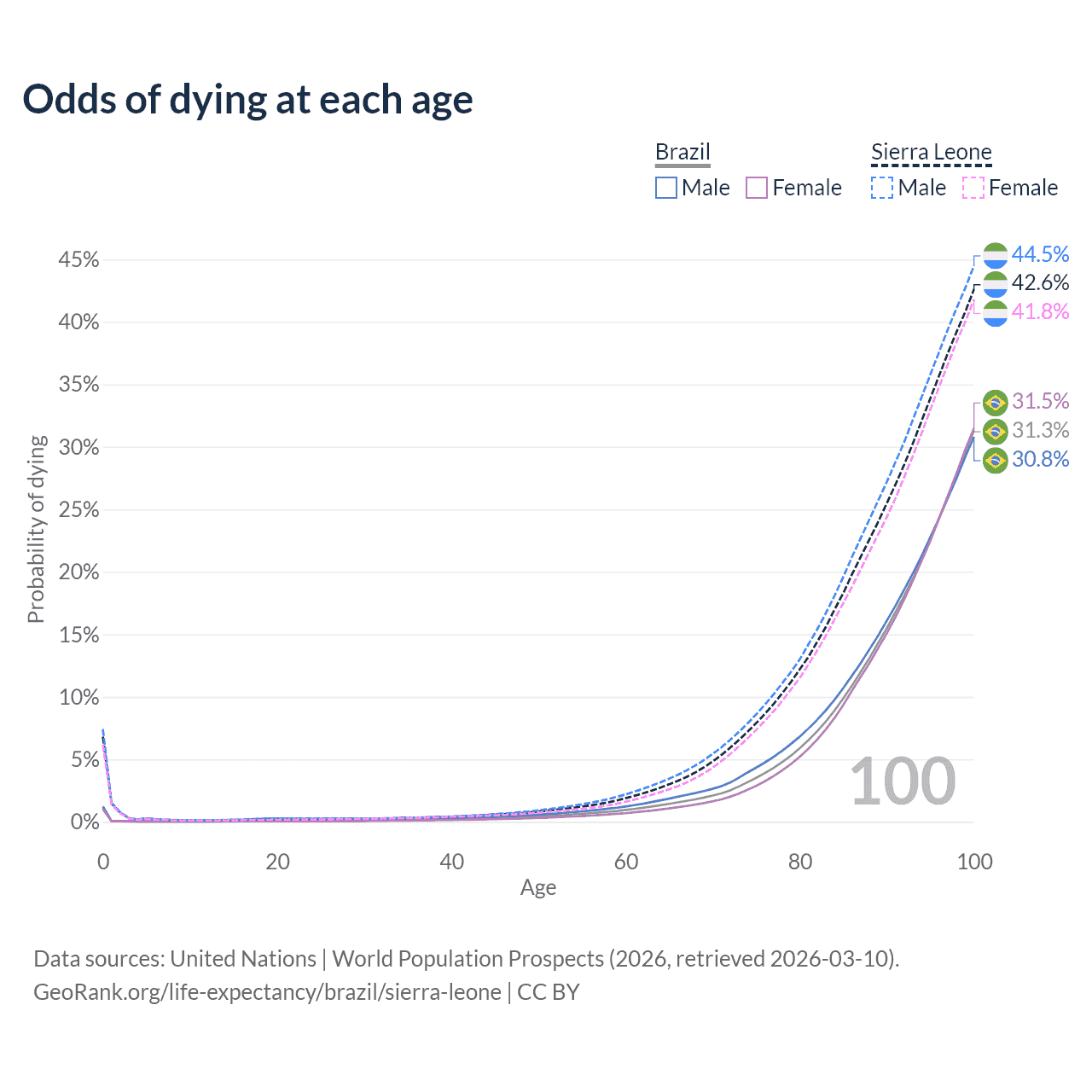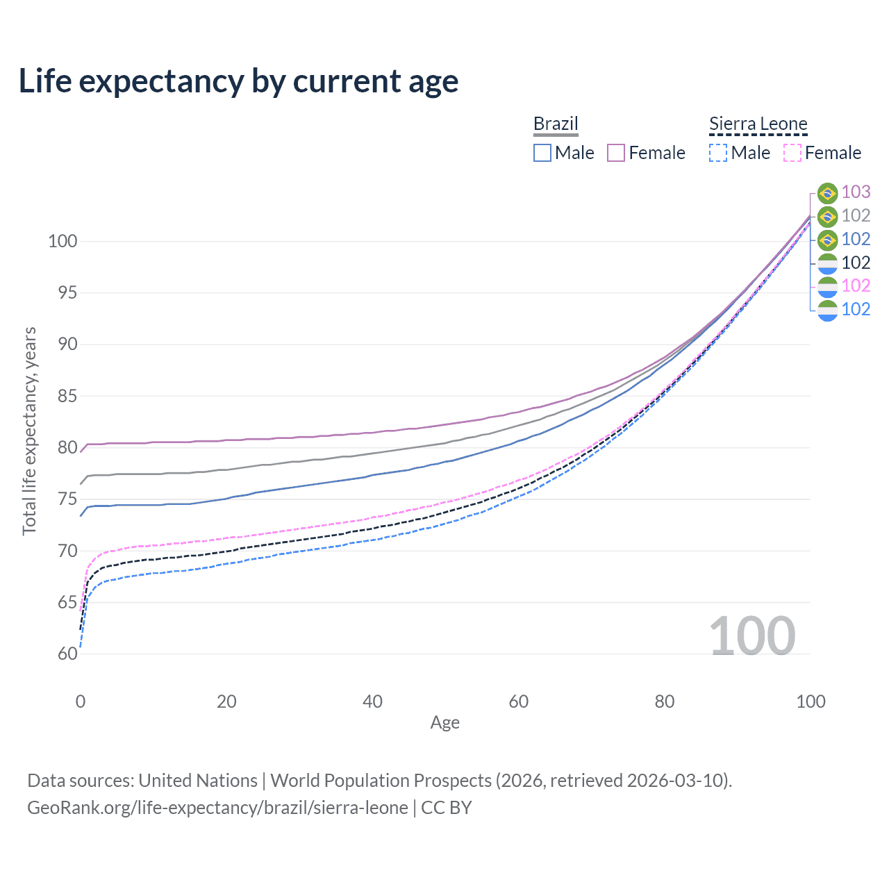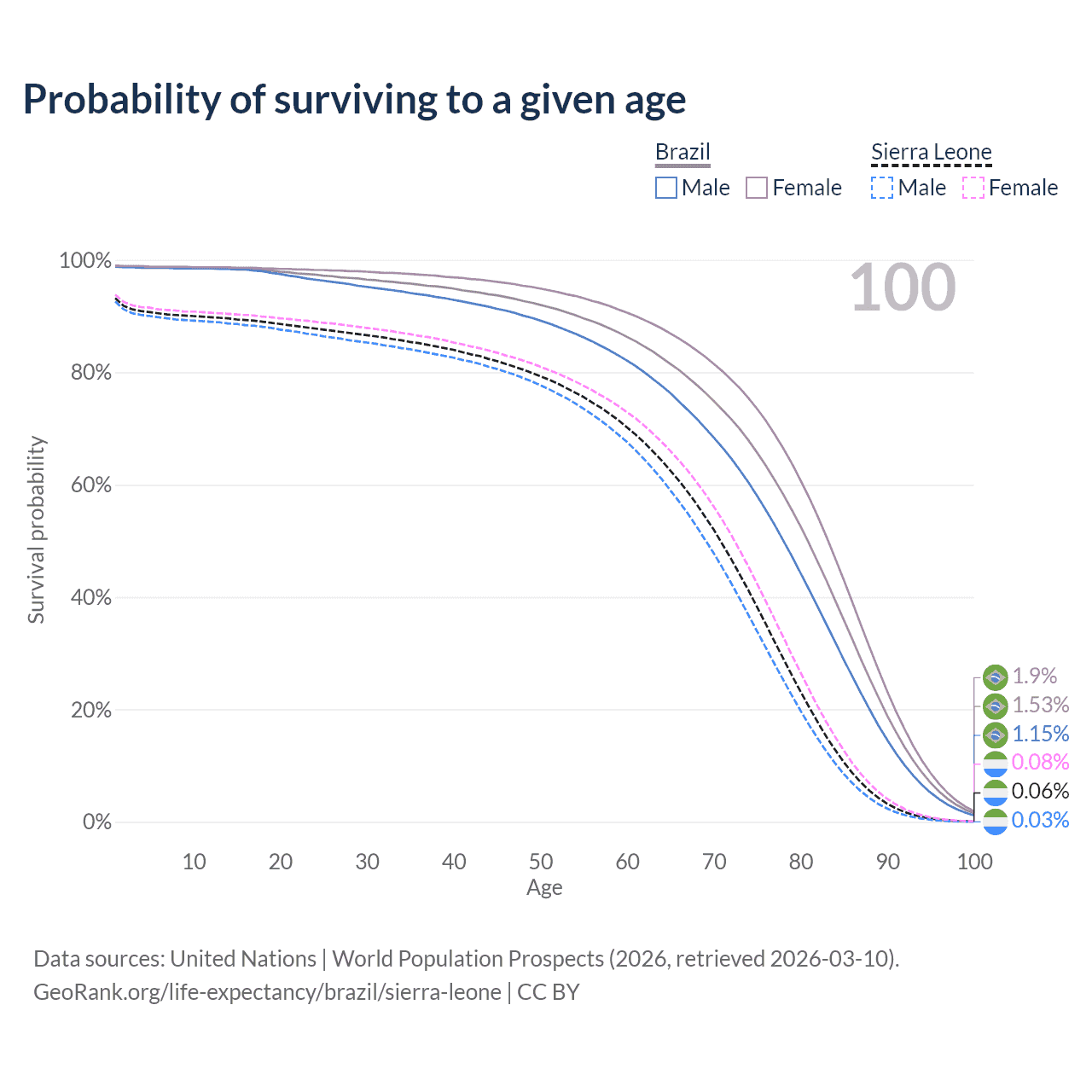 This life expectancy calculator shows the odds of living to 100, 95, 90, and below based on current age for both males and females in Brazil and Sierra Leone, along with mean and median age of death. The calculations are based on the 2026 life tables (actuarial tables) from the UN World Population Prospects.