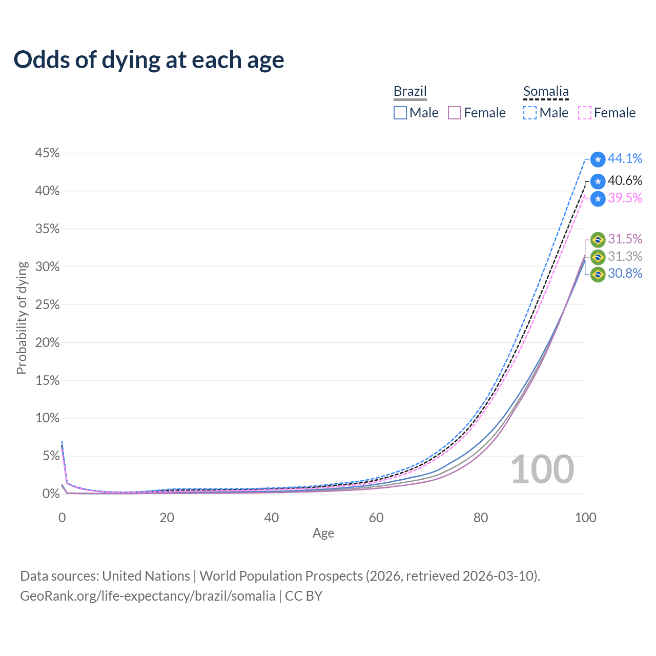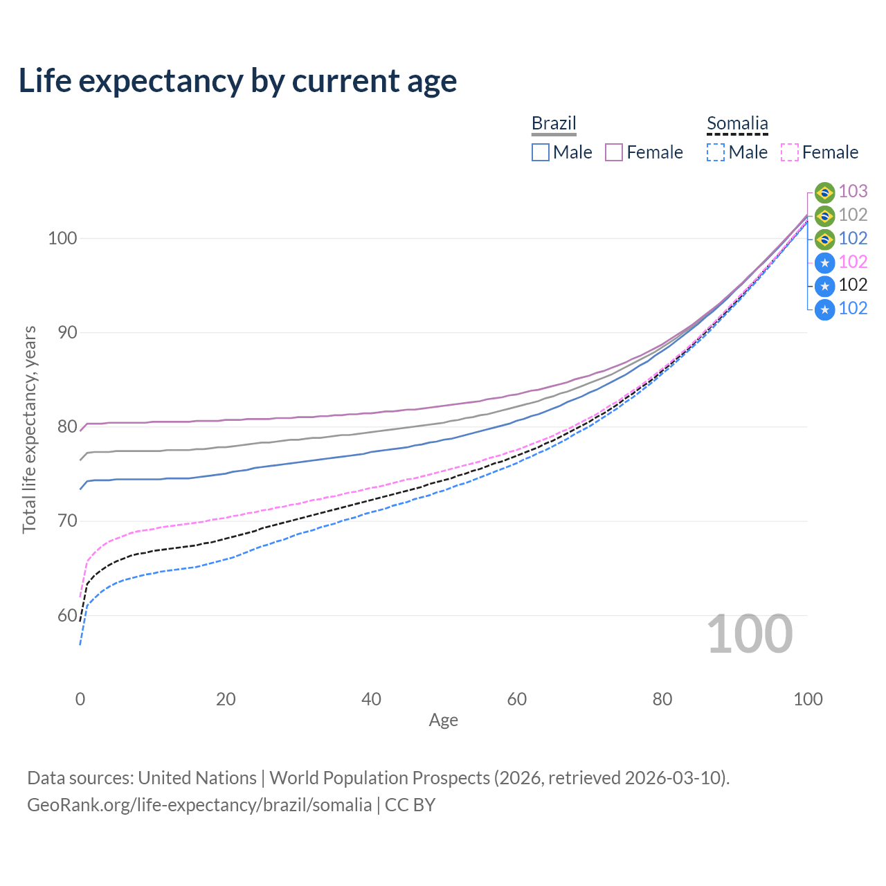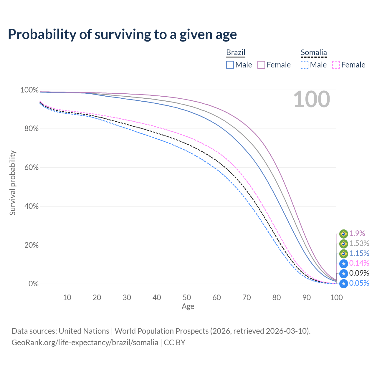 This life expectancy calculator shows the odds of living to 100, 95, 90, and below based on current age for both males and females in Brazil and Somalia, along with mean and median age of death. The calculations are based on the 2026 life tables (actuarial tables) from the UN World Population Prospects.
