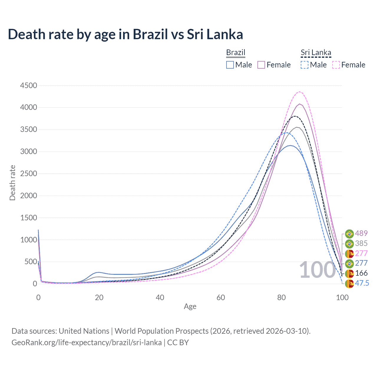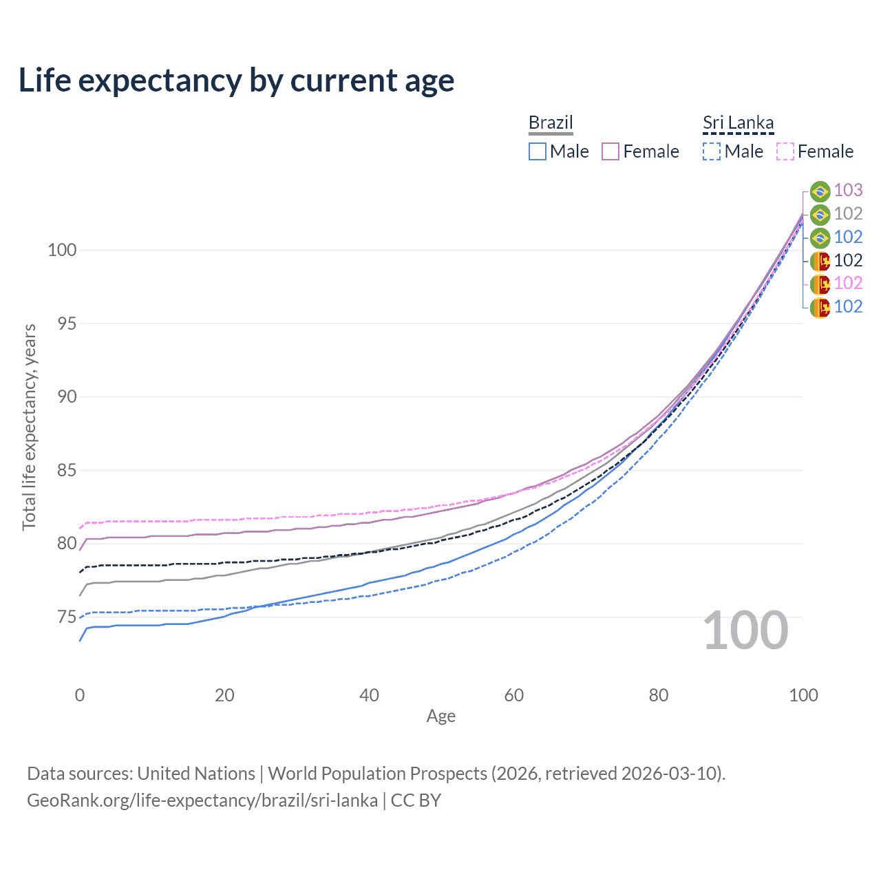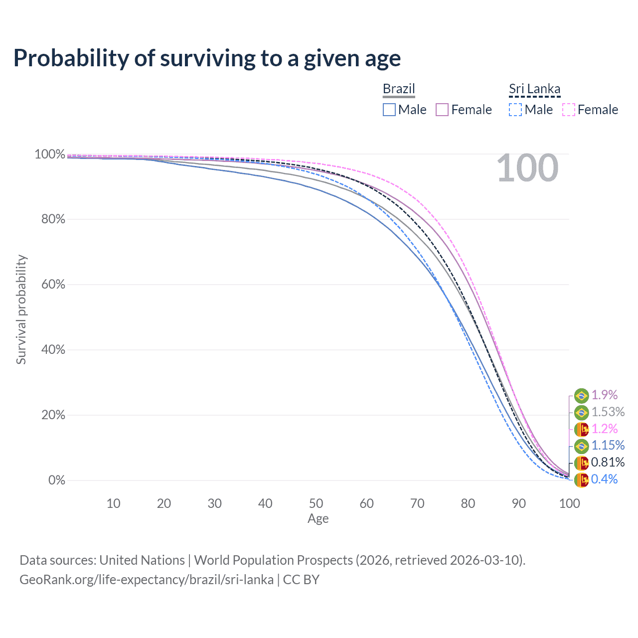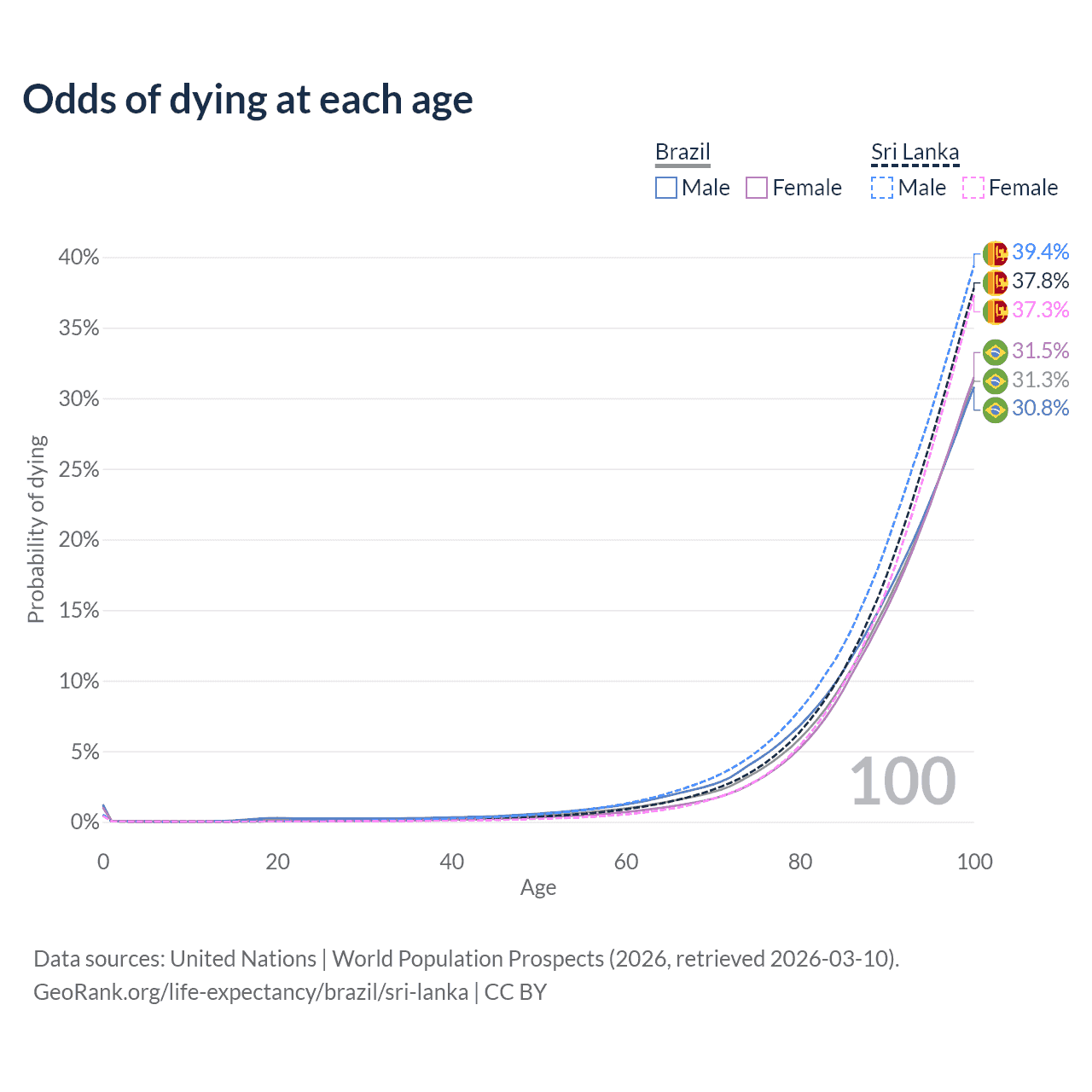 This life expectancy calculator shows the odds of living to 100, 95, 90, and below based on current age for both males and females in Brazil and Sri Lanka, along with mean and median age of death. The calculations are based on the 2026 life tables (actuarial tables) from the UN World Population Prospects.