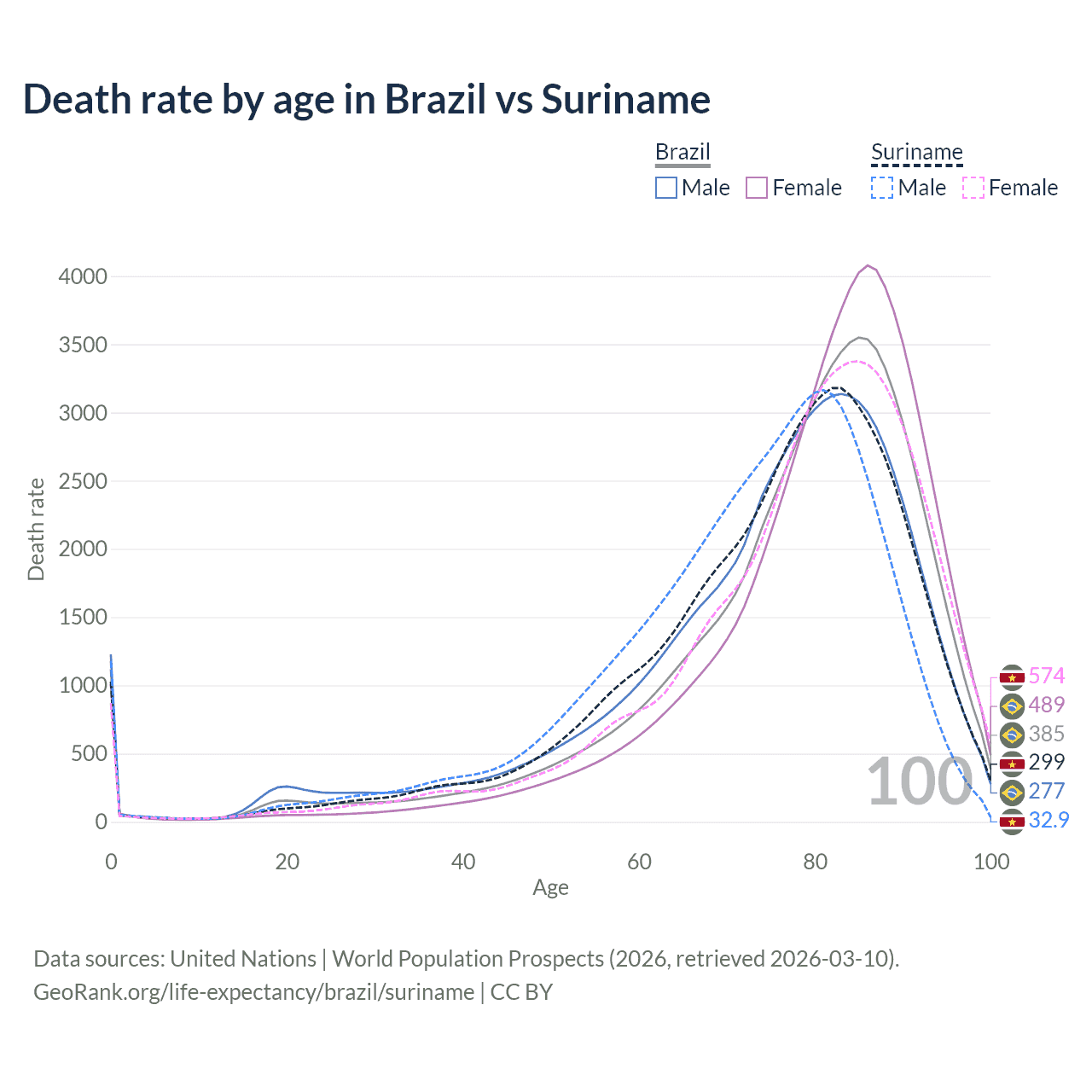 In Brazil, the most common age of death is 85, compared to 82 in Suriname. The median age of death is 80.8 in Brazil and 78 in Suriname, meaning only half of each cohort is expected to live past that age.