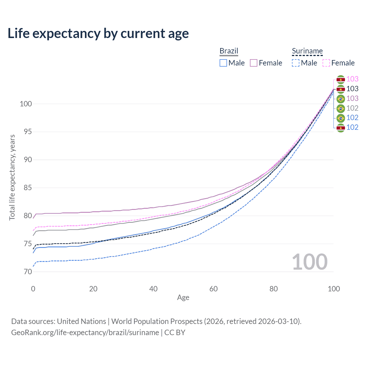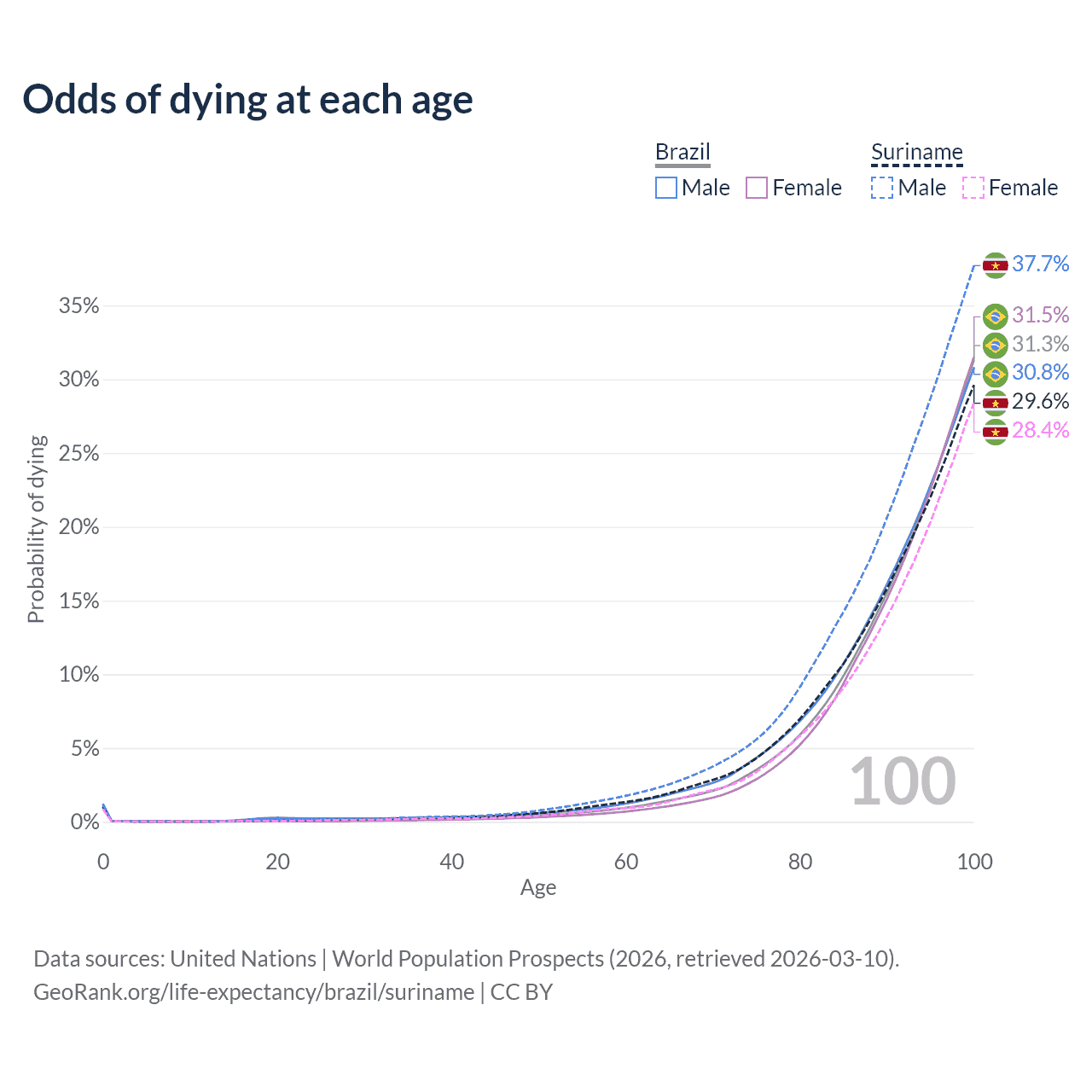 This life expectancy calculator shows the odds of living to 100, 95, 90, and below based on current age for both males and females in Brazil and Suriname, along with mean and median age of death. The calculations are based on the 2026 life tables (actuarial tables) from the UN World Population Prospects.