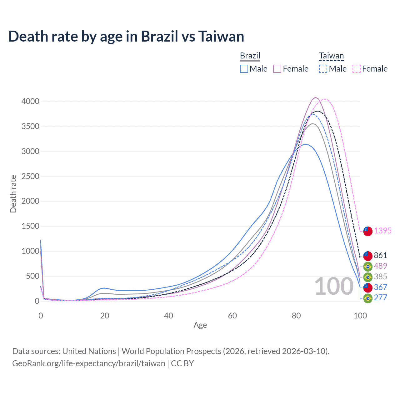 This life expectancy calculator shows the odds of living to 100, 95, 90, and below based on current age for both males and females in Brazil and Taiwan, along with mean and median age of death. The calculations are based on the 2026 life tables (actuarial tables) from the UN World Population Prospects.