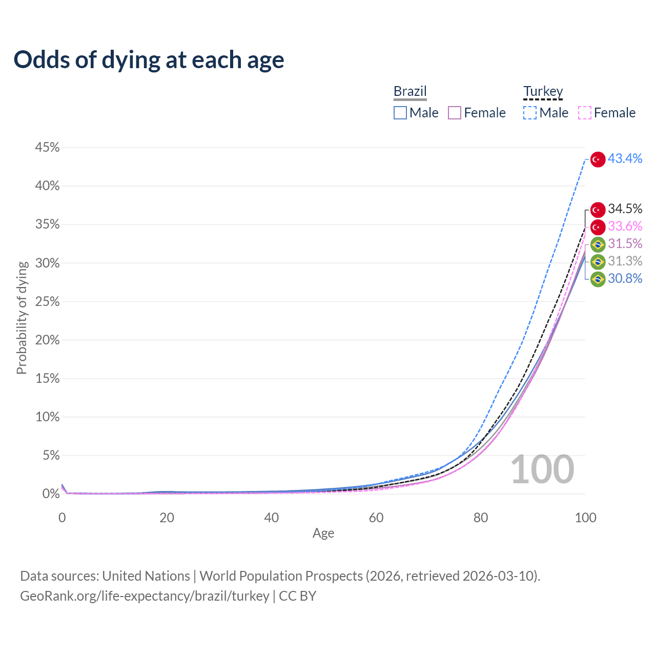 This life expectancy calculator shows the odds of living to 100, 95, 90, and below based on current age for both males and females in Brazil and Turkey, along with mean and median age of death. The calculations are based on the 2026 life tables (actuarial tables) from the UN World Population Prospects.