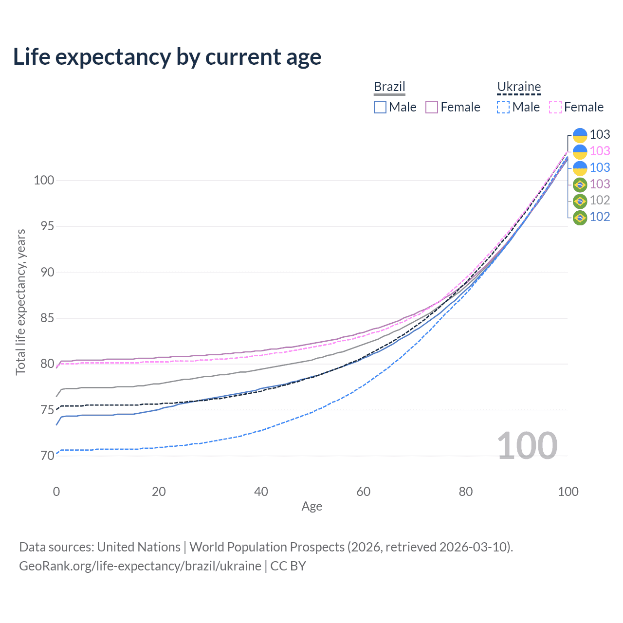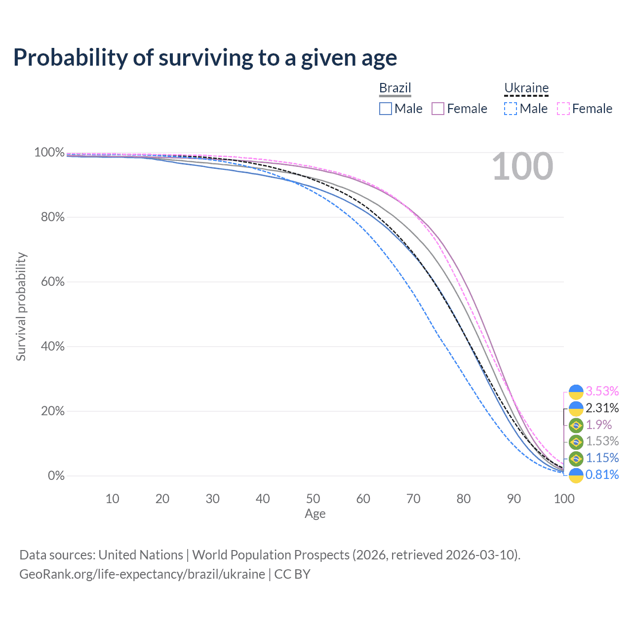 This life expectancy calculator shows the odds of living to 100, 95, 90, and below based on current age for both males and females in Brazil and Ukraine, along with mean and median age of death. The calculations are based on the 2026 life tables (actuarial tables) from the UN World Population Prospects.