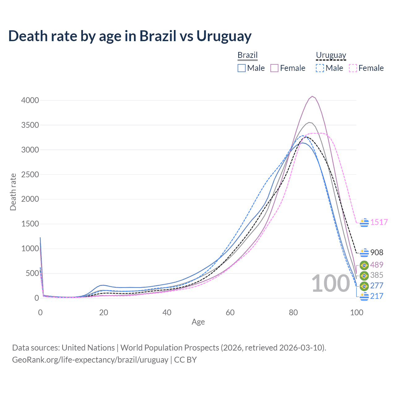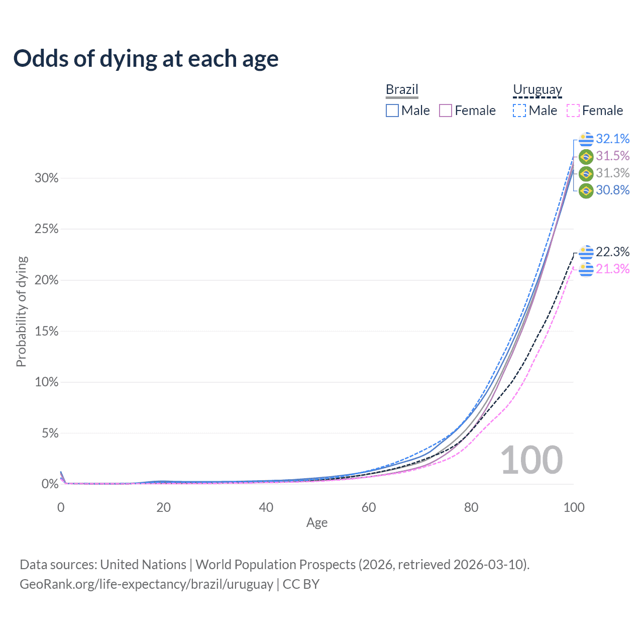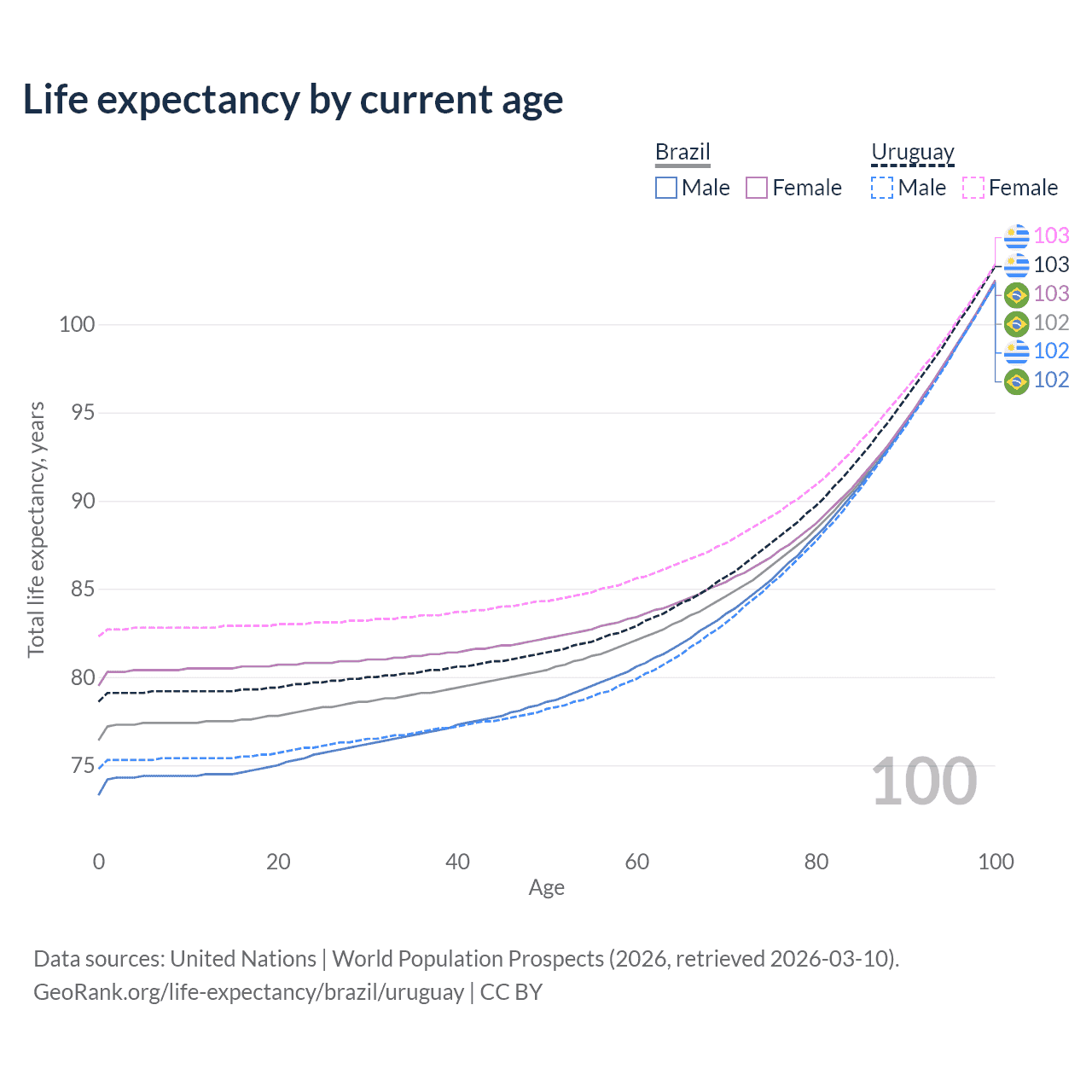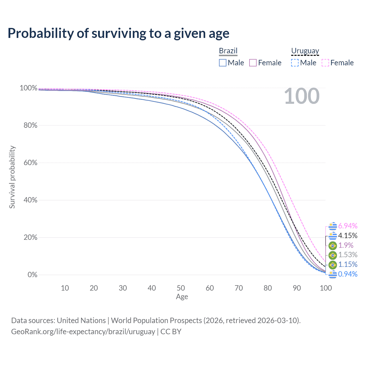 This life expectancy calculator shows the odds of living to 100, 95, 90, and below based on current age for both males and females in Brazil and Uruguay, along with mean and median age of death. The calculations are based on the 2026 life tables (actuarial tables) from the UN World Population Prospects.