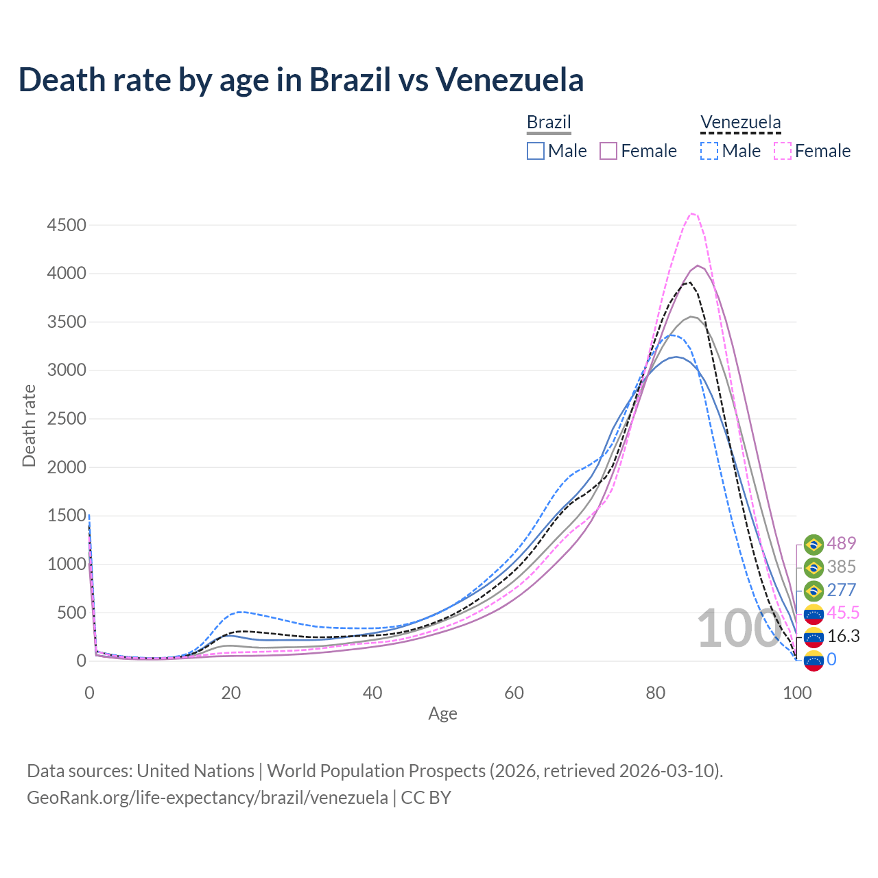 In Brazil, the most common age of death is 85, compared to 85 in Venezuela. The median age of death is 80.8 in Brazil and 79 in Venezuela, meaning only half of each cohort is expected to live past that age.