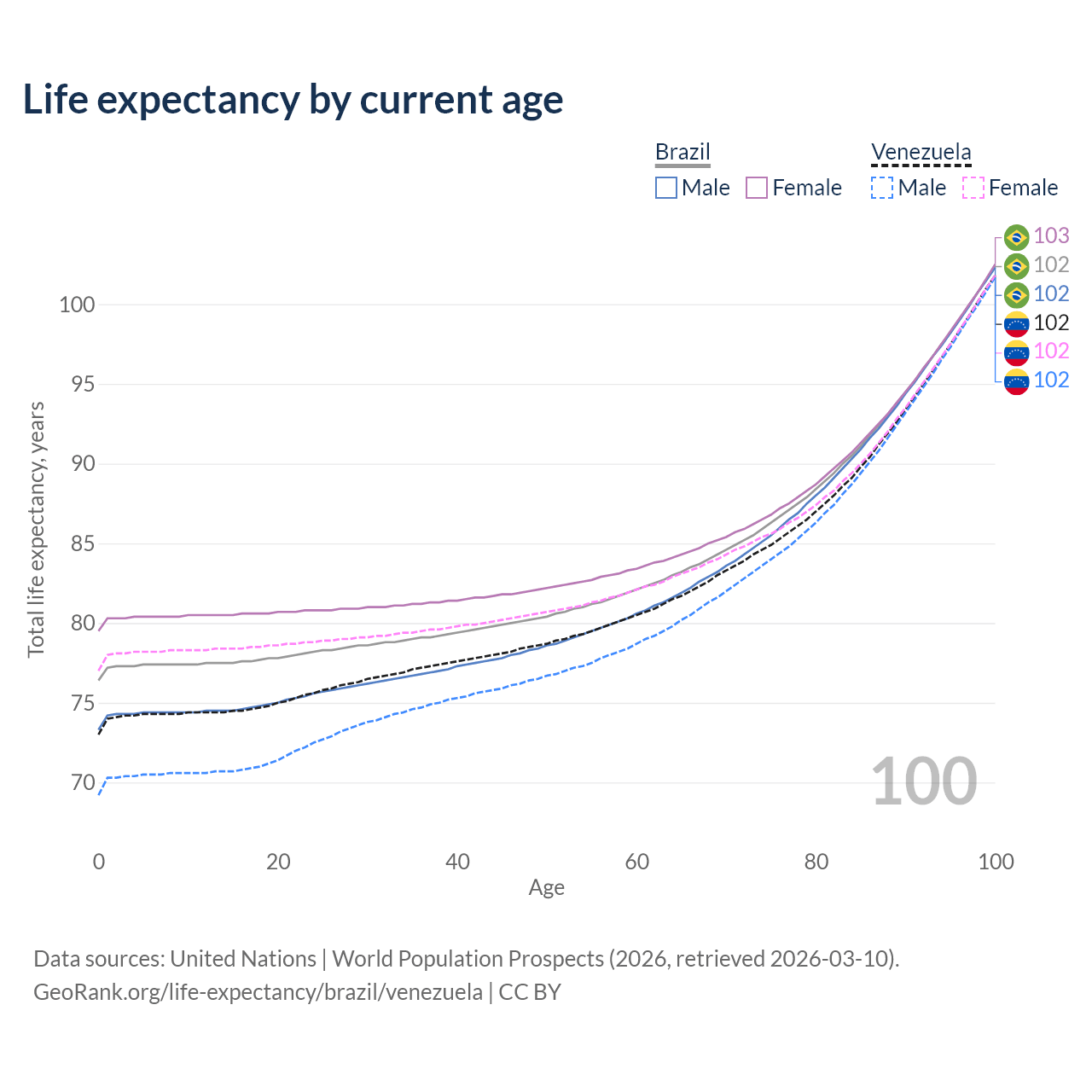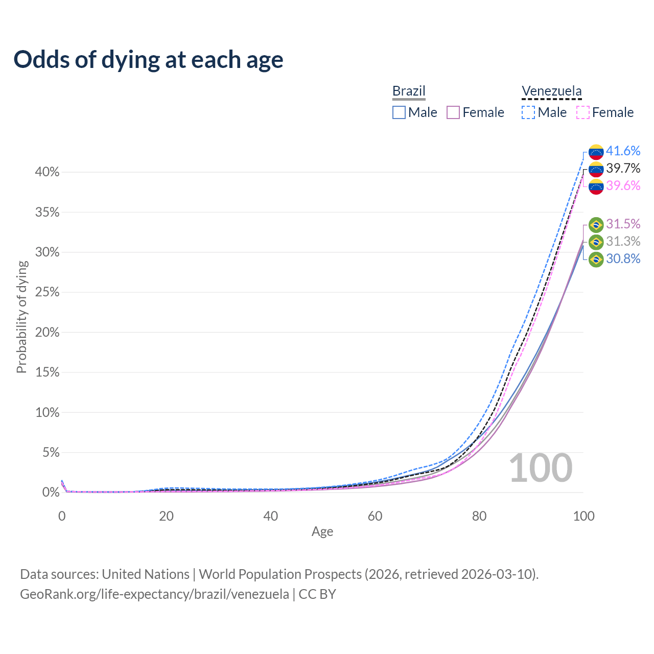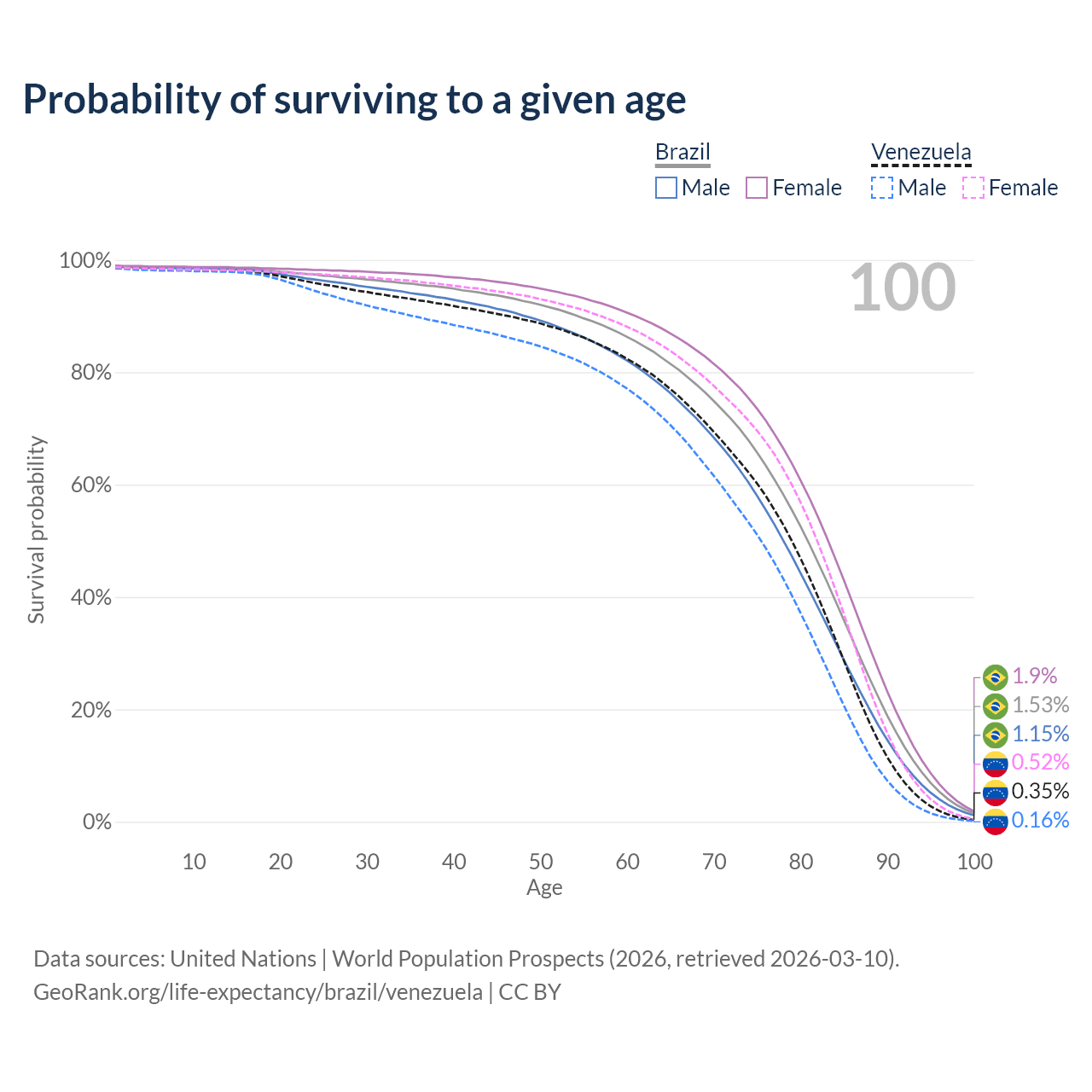 This life expectancy calculator shows the odds of living to 100, 95, 90, and below based on current age for both males and females in Brazil and Venezuela, along with mean and median age of death. The calculations are based on the 2026 life tables (actuarial tables) from the UN World Population Prospects.