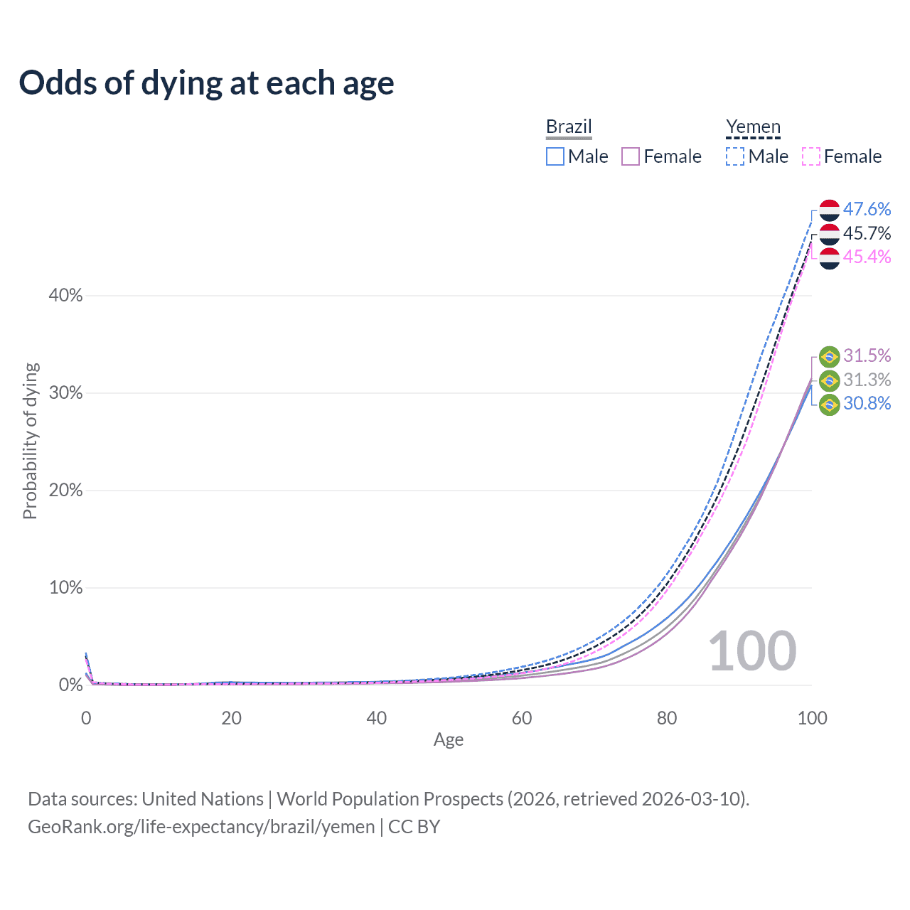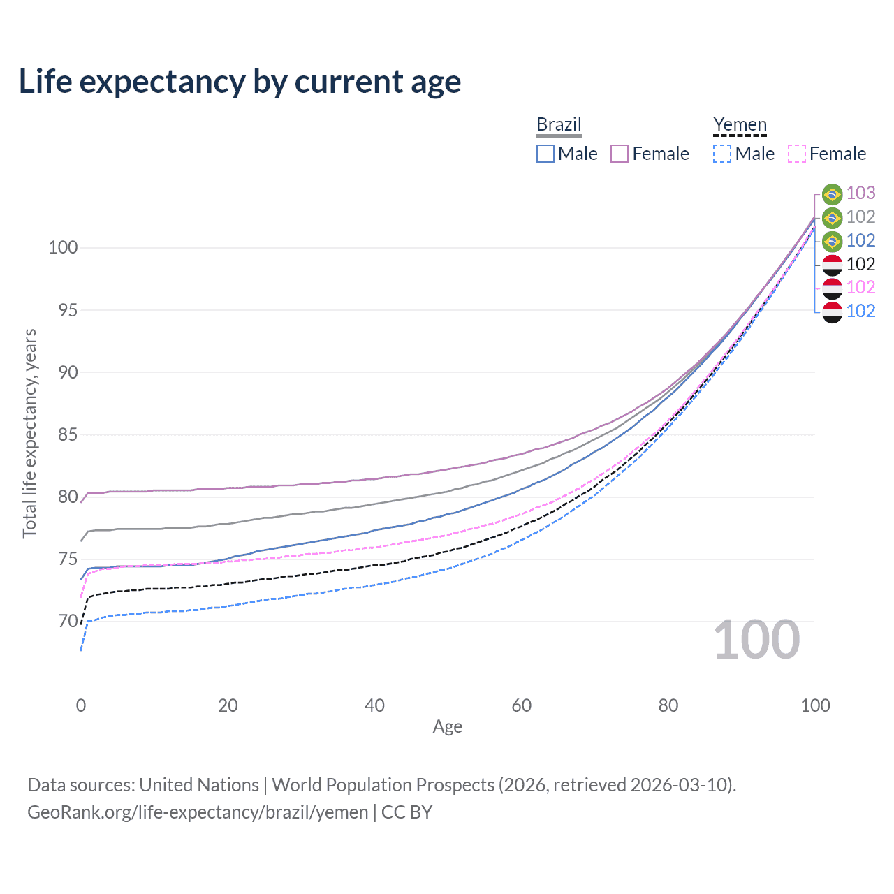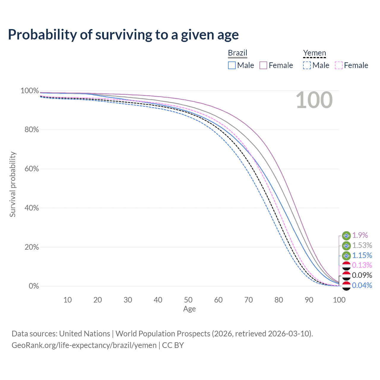 This life expectancy calculator shows the odds of living to 100, 95, 90, and below based on current age for both males and females in Brazil and Yemen, along with mean and median age of death. The calculations are based on the 2026 life tables (actuarial tables) from the UN World Population Prospects.