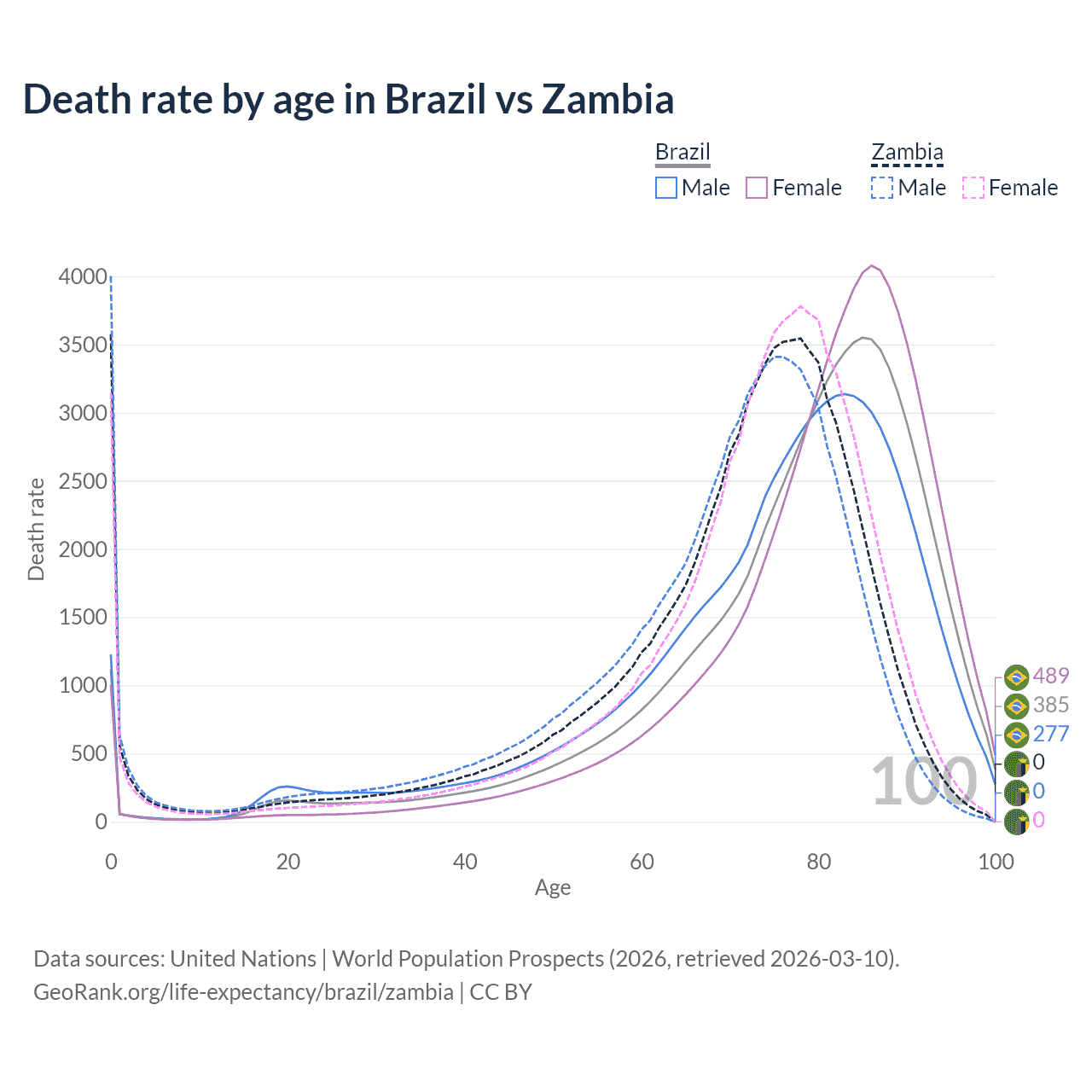 In Brazil, the most common age of death is 85, compared to 0 in Zambia. The median age of death is 80.8 in Brazil and 73.1 in Zambia, meaning only half of each cohort is expected to live past that age.