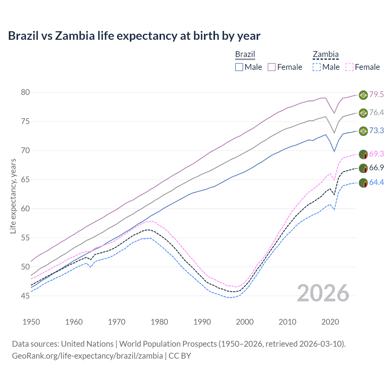 The average life expectancy at birth is 76.4 years in Brazil vs 66.9 in Zambia. Brazil is ranked 82/197 by life expectancy, and Zambia is 161/197. In Brazil, the life expectancy is 73.3 years for males and 79.5 years for females. In Zambia, it's 64.4 years for males and 69.3 years for females.