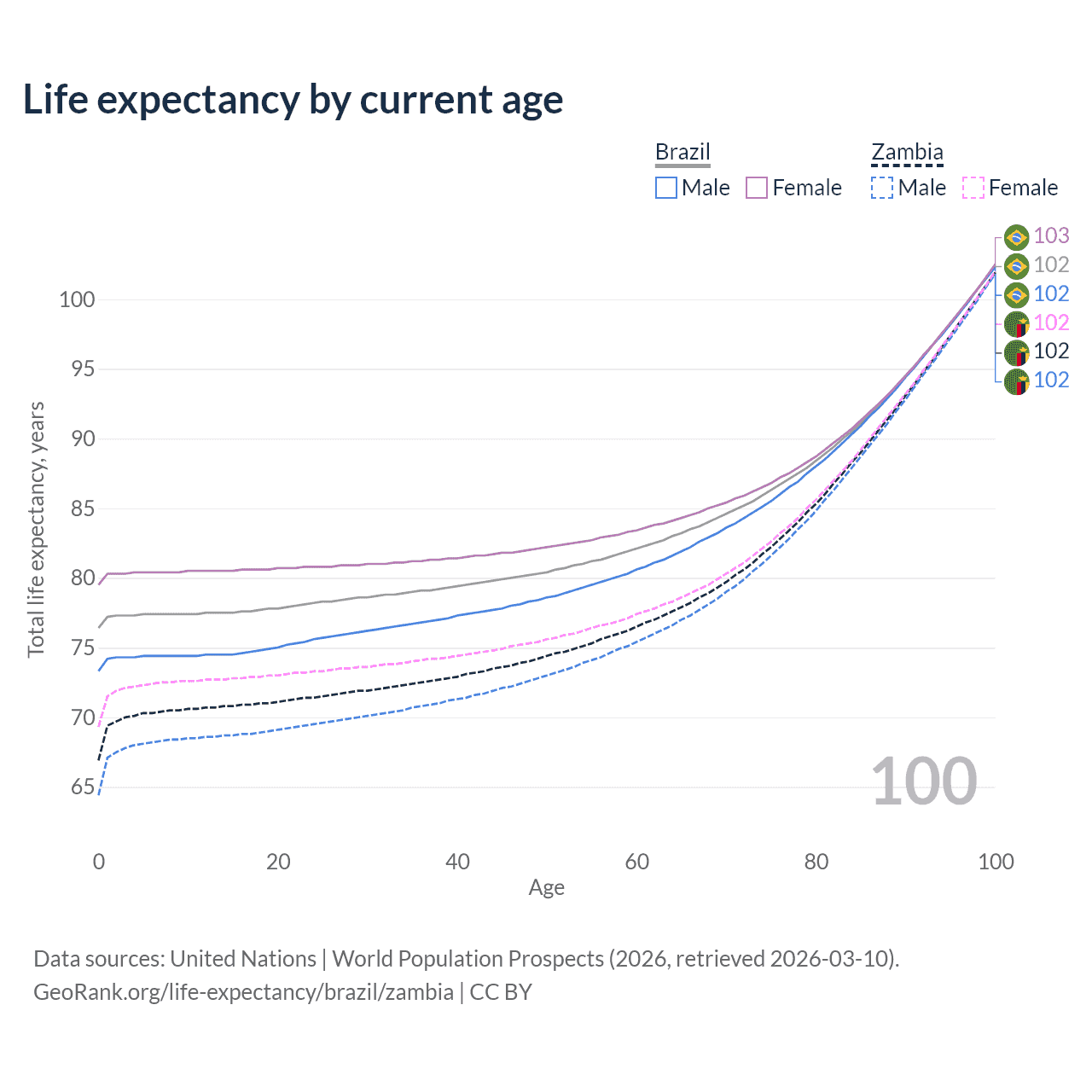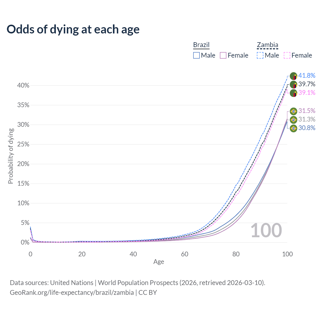 This life expectancy calculator shows the odds of living to 100, 95, 90, and below based on current age for both males and females in Brazil and Zambia, along with mean and median age of death. The calculations are based on the 2026 life tables (actuarial tables) from the UN World Population Prospects.