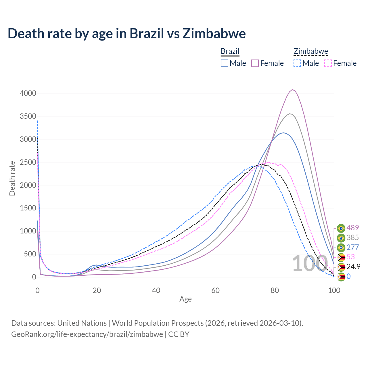 In Brazil, the most common age of death is 85, compared to 0 in Zimbabwe. The median age of death is 80.8 in Brazil and 68.8 in Zimbabwe, meaning only half of each cohort is expected to live past that age.