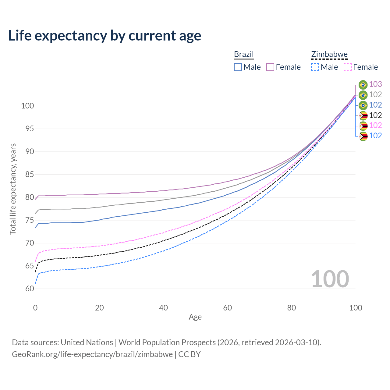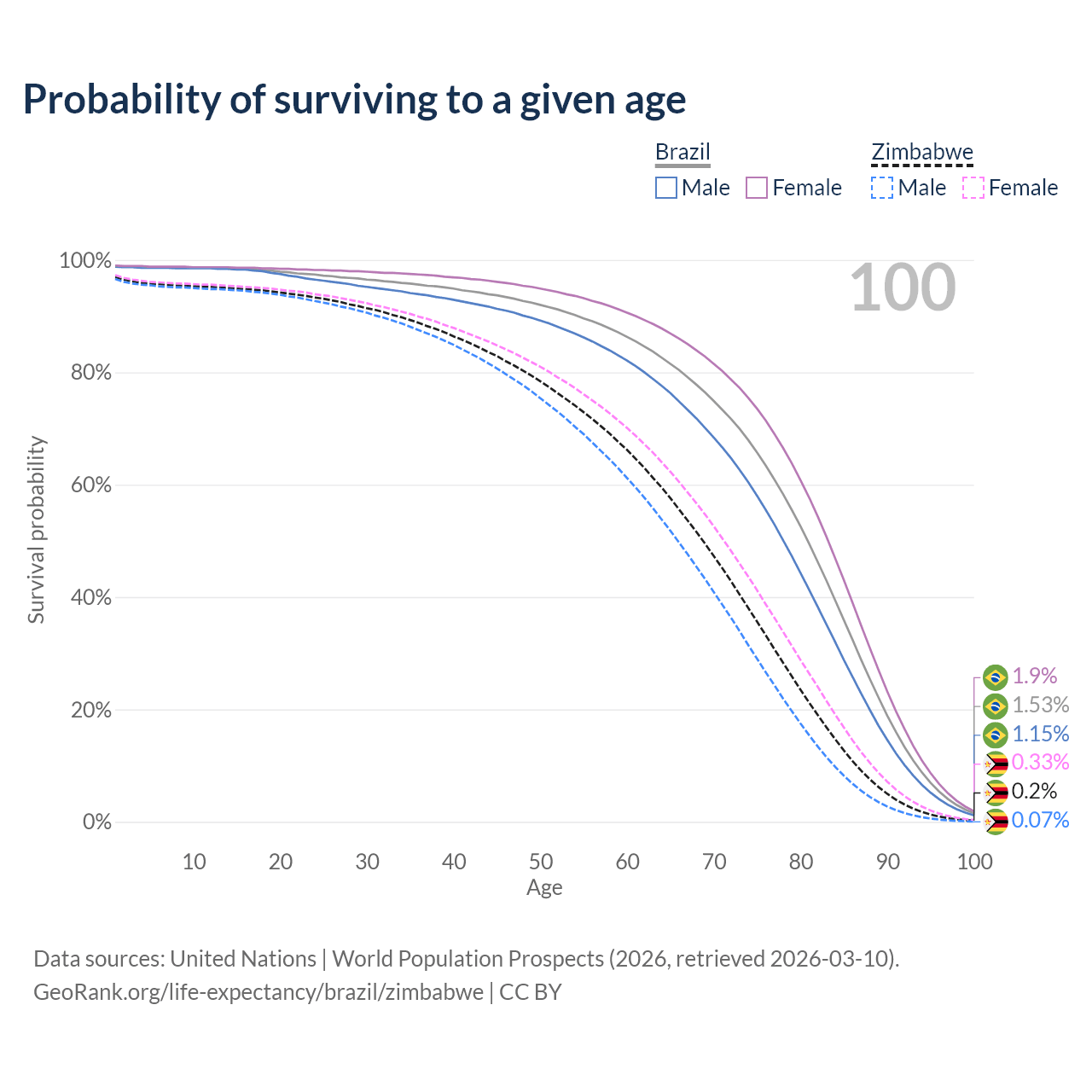This life expectancy calculator shows the odds of living to 100, 95, 90, and below based on current age for both males and females in Brazil and Zimbabwe, along with mean and median age of death. The calculations are based on the 2026 life tables (actuarial tables) from the UN World Population Prospects.
