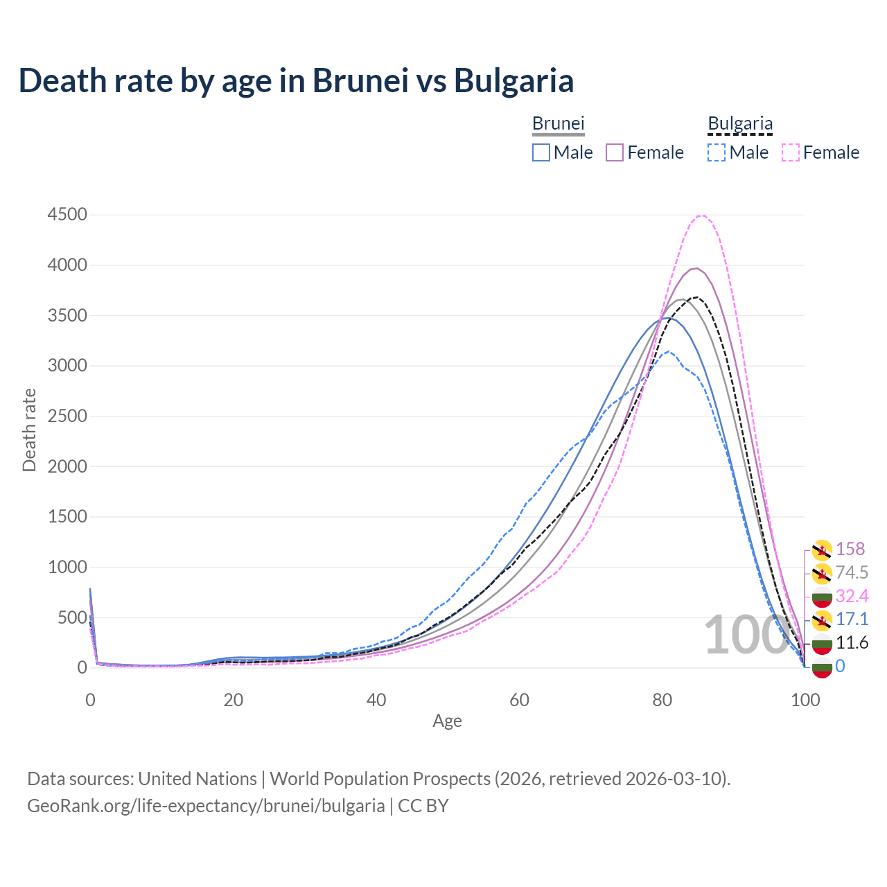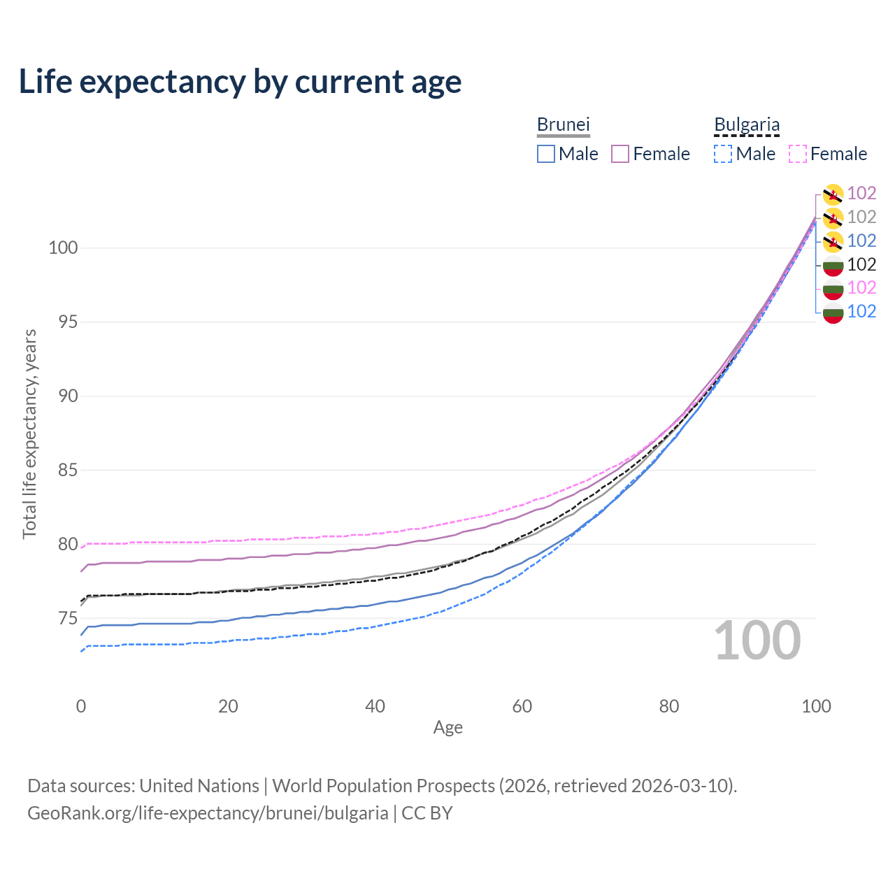 This life expectancy calculator shows the odds of living to 100, 95, 90, and below based on current age for both males and females in Brunei and Bulgaria, along with mean and median age of death. The calculations are based on the 2026 life tables (actuarial tables) from the UN World Population Prospects.