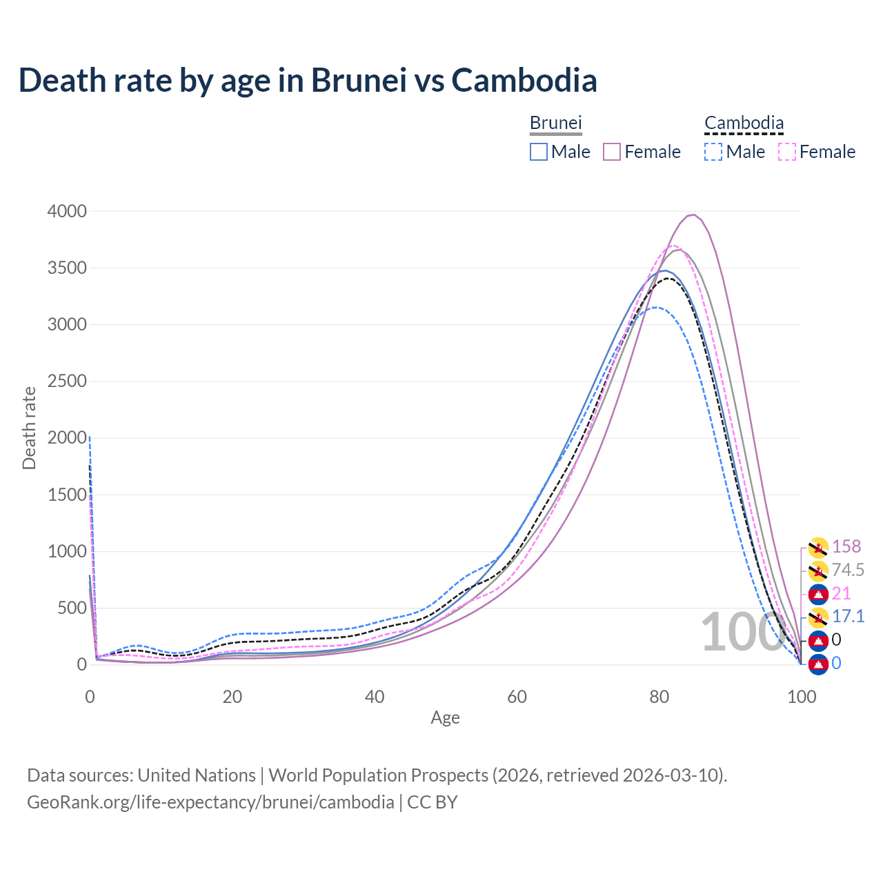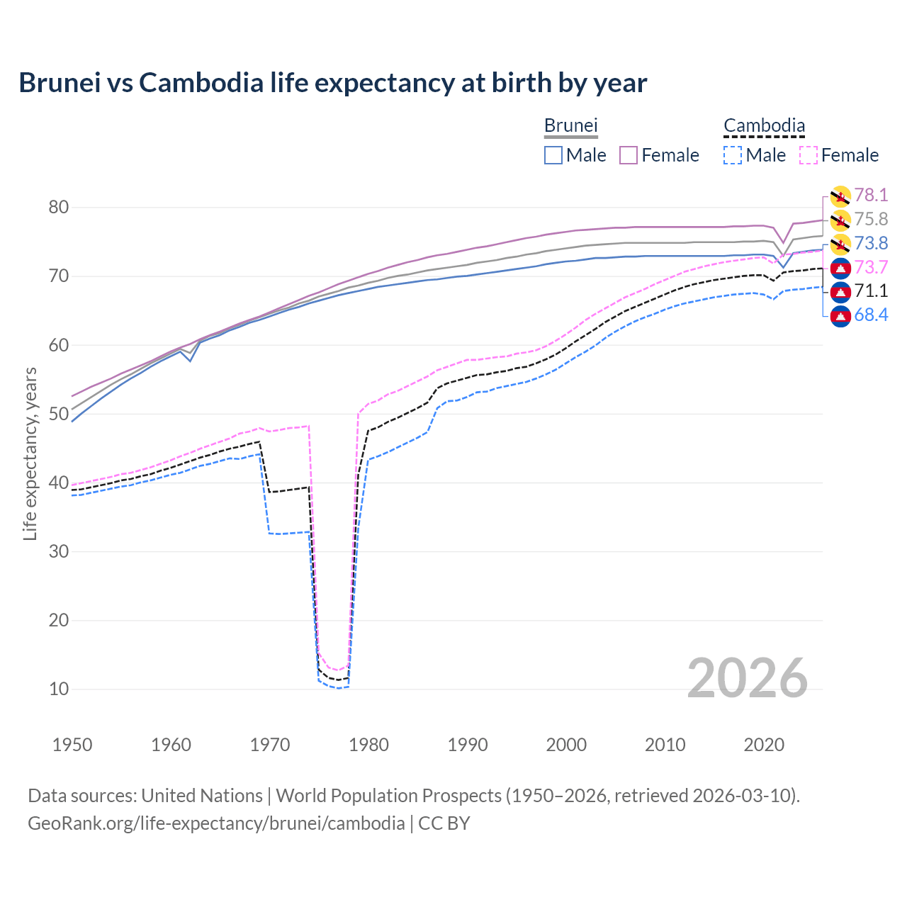 The average life expectancy at birth is 75.8 years in Brunei vs 71.1 in Cambodia. Brunei is ranked 86/197 by life expectancy, and Cambodia is 132/197. In Brunei, the life expectancy is 73.8 years for males and 78.1 years for females. In Cambodia, it's 68.4 years for males and 73.7 years for females.