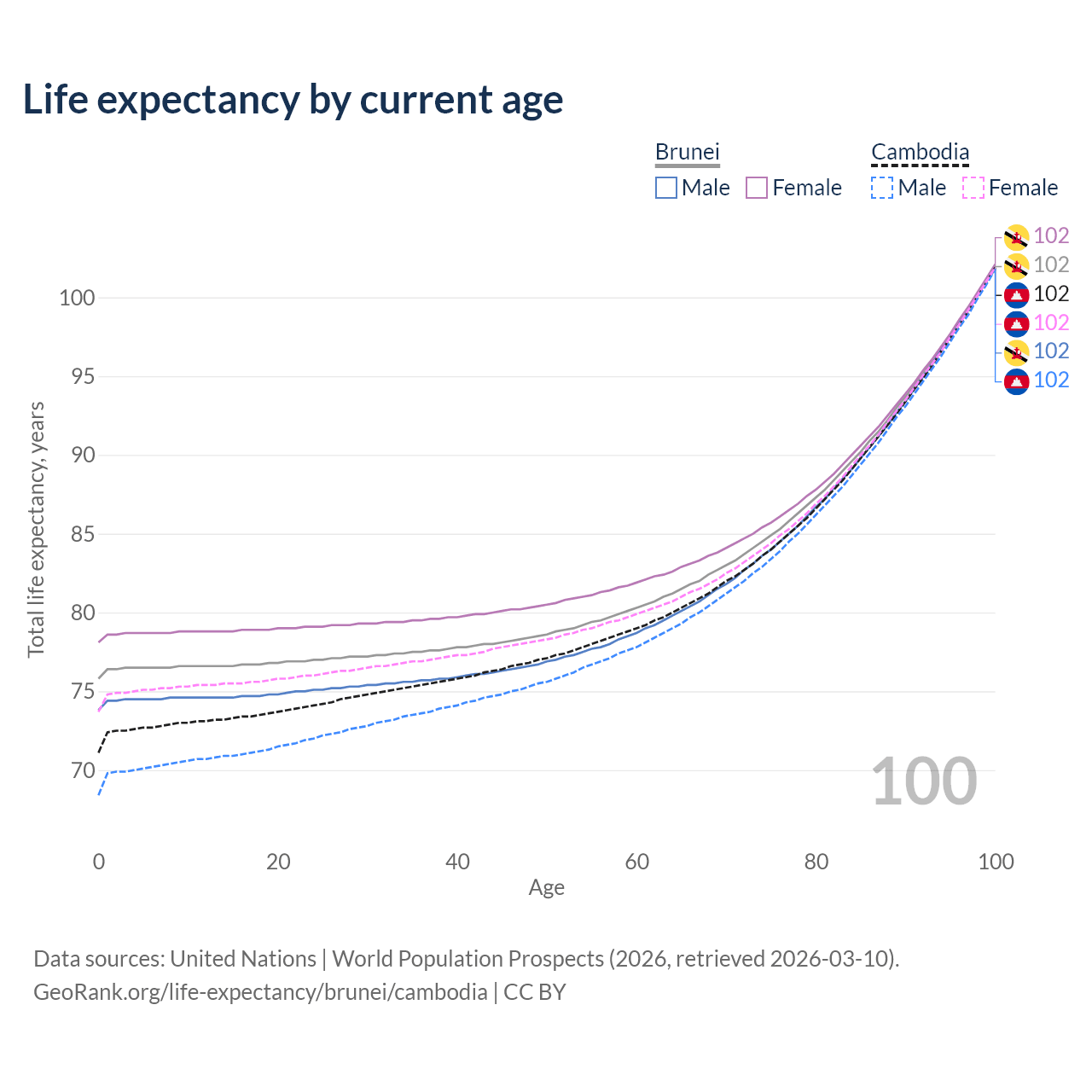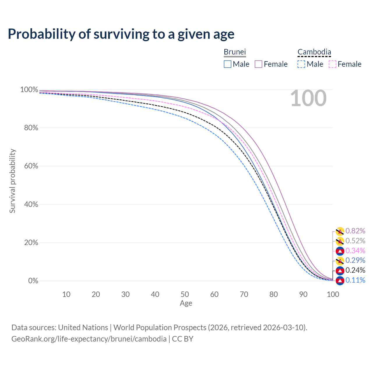 This life expectancy calculator shows the odds of living to 100, 95, 90, and below based on current age for both males and females in Brunei and Cambodia, along with mean and median age of death. The calculations are based on the 2026 life tables (actuarial tables) from the UN World Population Prospects.