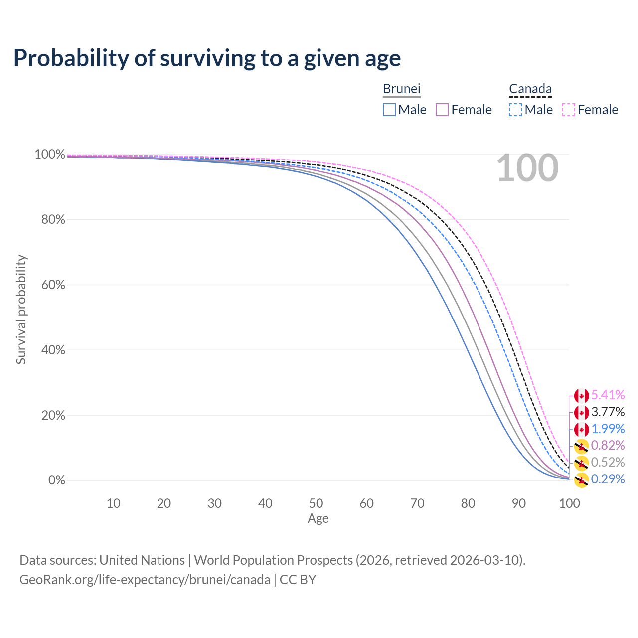 This life expectancy calculator shows the odds of living to 100, 95, 90, and below based on current age for both males and females in Brunei and Canada, along with mean and median age of death. The calculations are based on the 2026 life tables (actuarial tables) from the UN World Population Prospects.