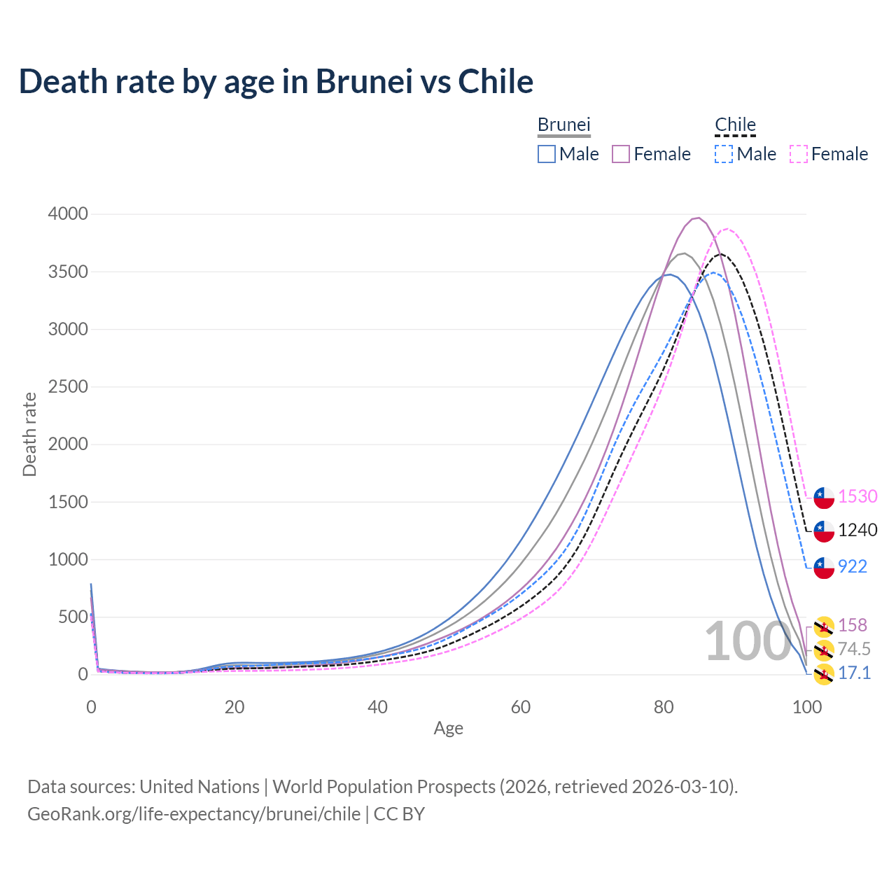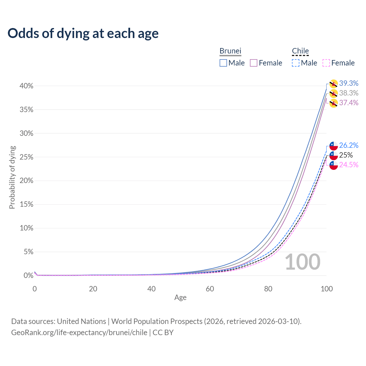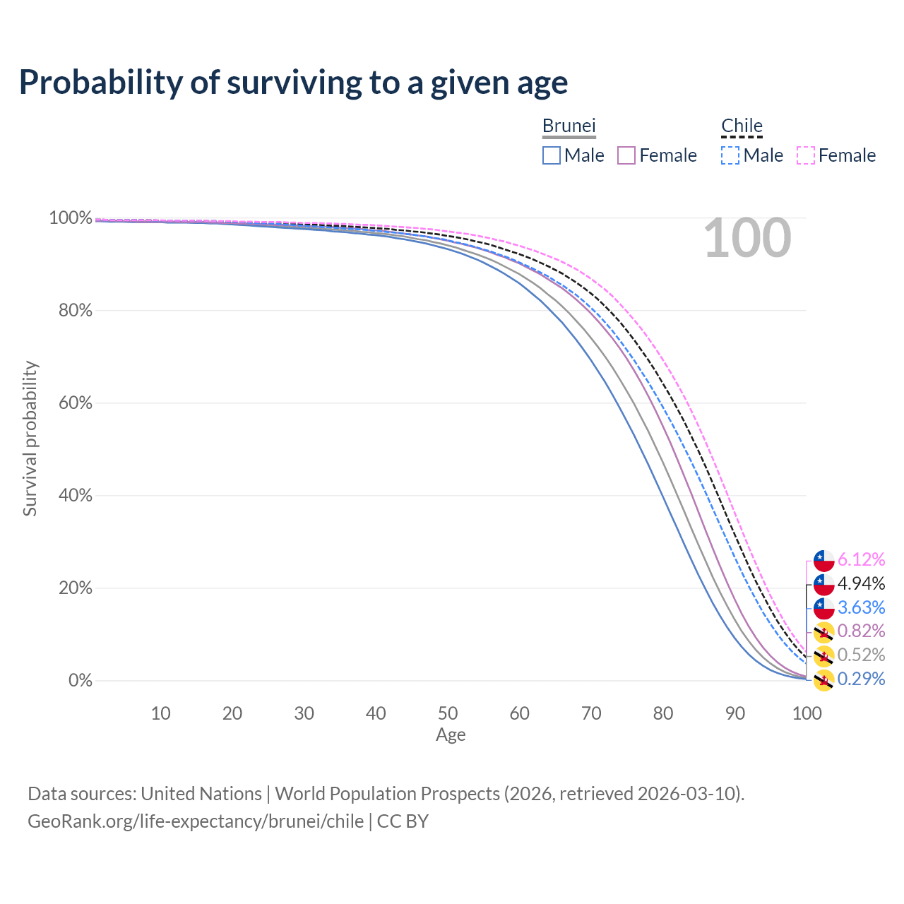 This life expectancy calculator shows the odds of living to 100, 95, 90, and below based on current age for both males and females in Brunei and Chile, along with mean and median age of death. The calculations are based on the 2026 life tables (actuarial tables) from the UN World Population Prospects.