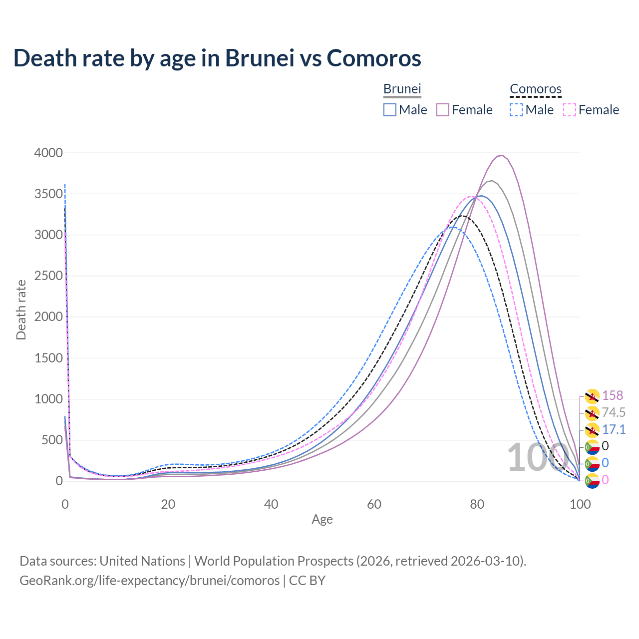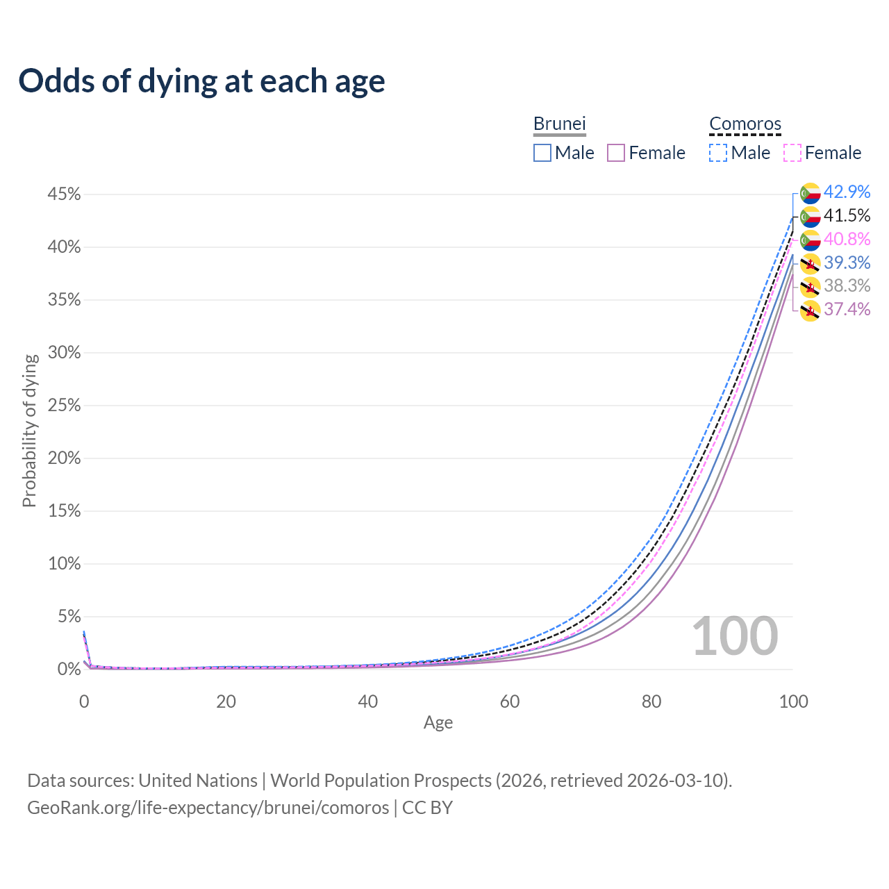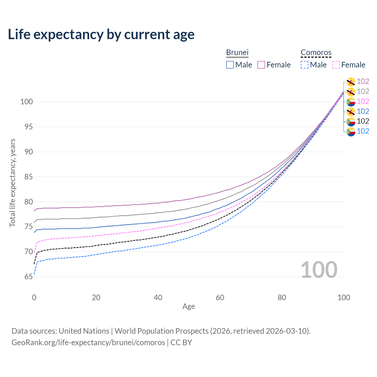 This life expectancy calculator shows the odds of living to 100, 95, 90, and below based on current age for both males and females in Brunei and Comoros, along with mean and median age of death. The calculations are based on the 2026 life tables (actuarial tables) from the UN World Population Prospects.