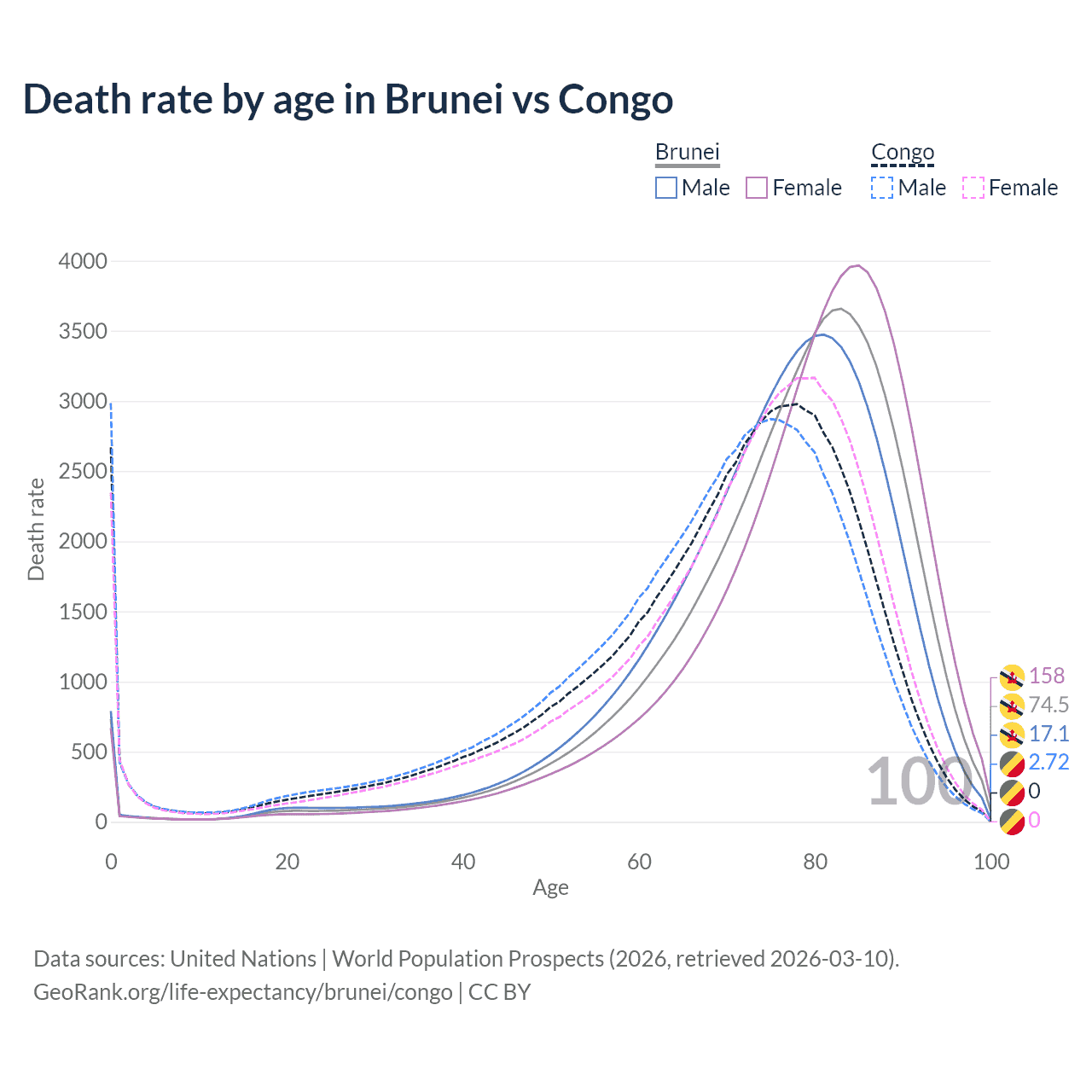 In Brunei, the most common age of death is 83, compared to 78 in the Congo. The median age of death is 79.2 in Brunei and 71.8 in the Congo, meaning only half of each cohort is expected to live past that age.