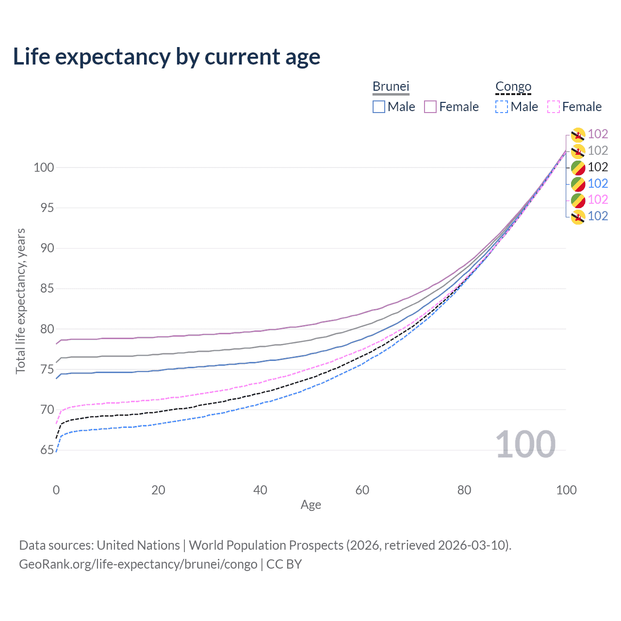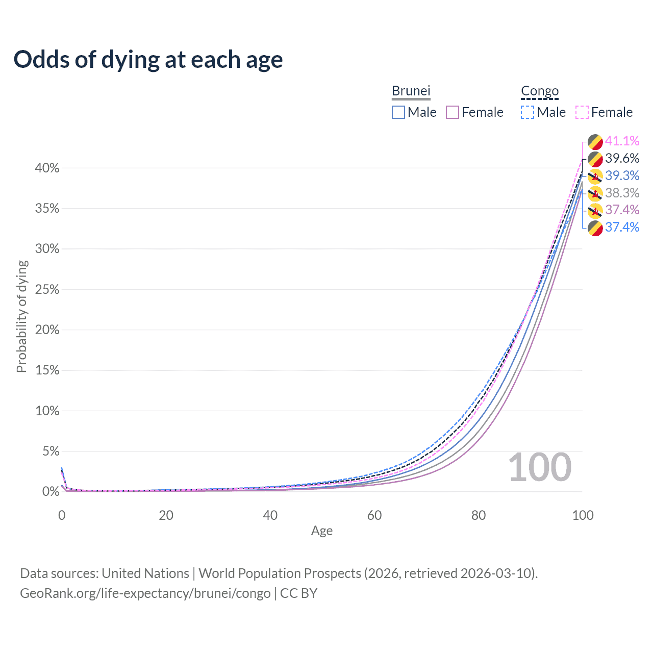 This life expectancy calculator shows the odds of living to 100, 95, 90, and below based on current age for both males and females in Brunei and the Congo, along with mean and median age of death. The calculations are based on the 2026 life tables (actuarial tables) from the UN World Population Prospects.